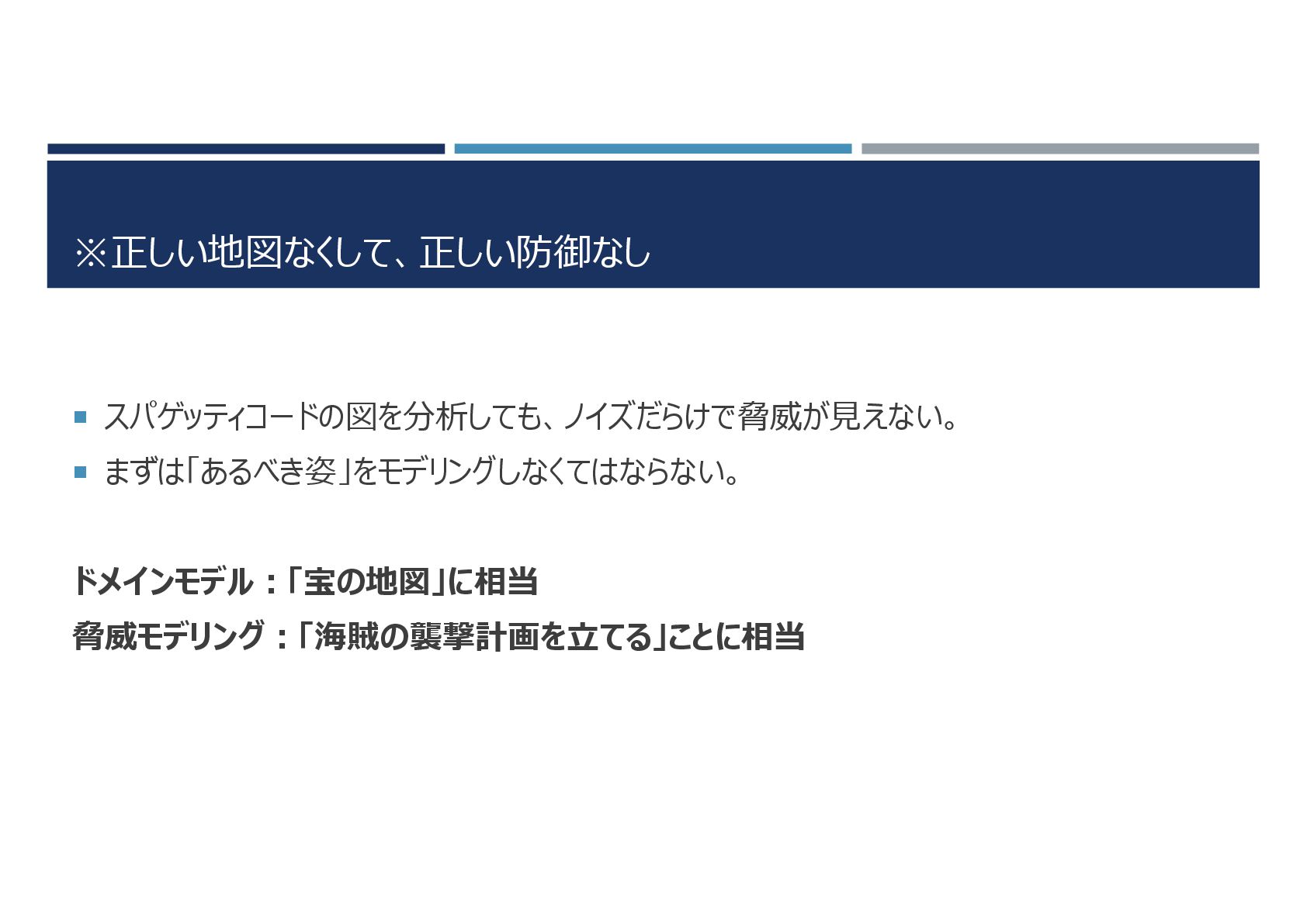 ※正しい地図なくして、正しい防御なし スパゲッティコードの図を分析しても、ノイズだらけで脅威が見えない。 まずは「あるべき姿」をモデリングしなくてはならない。 ドメインモデル:「宝の地図」に相当 脅威モデリング:「海賊の襲撃計画を立てる」ことに相当