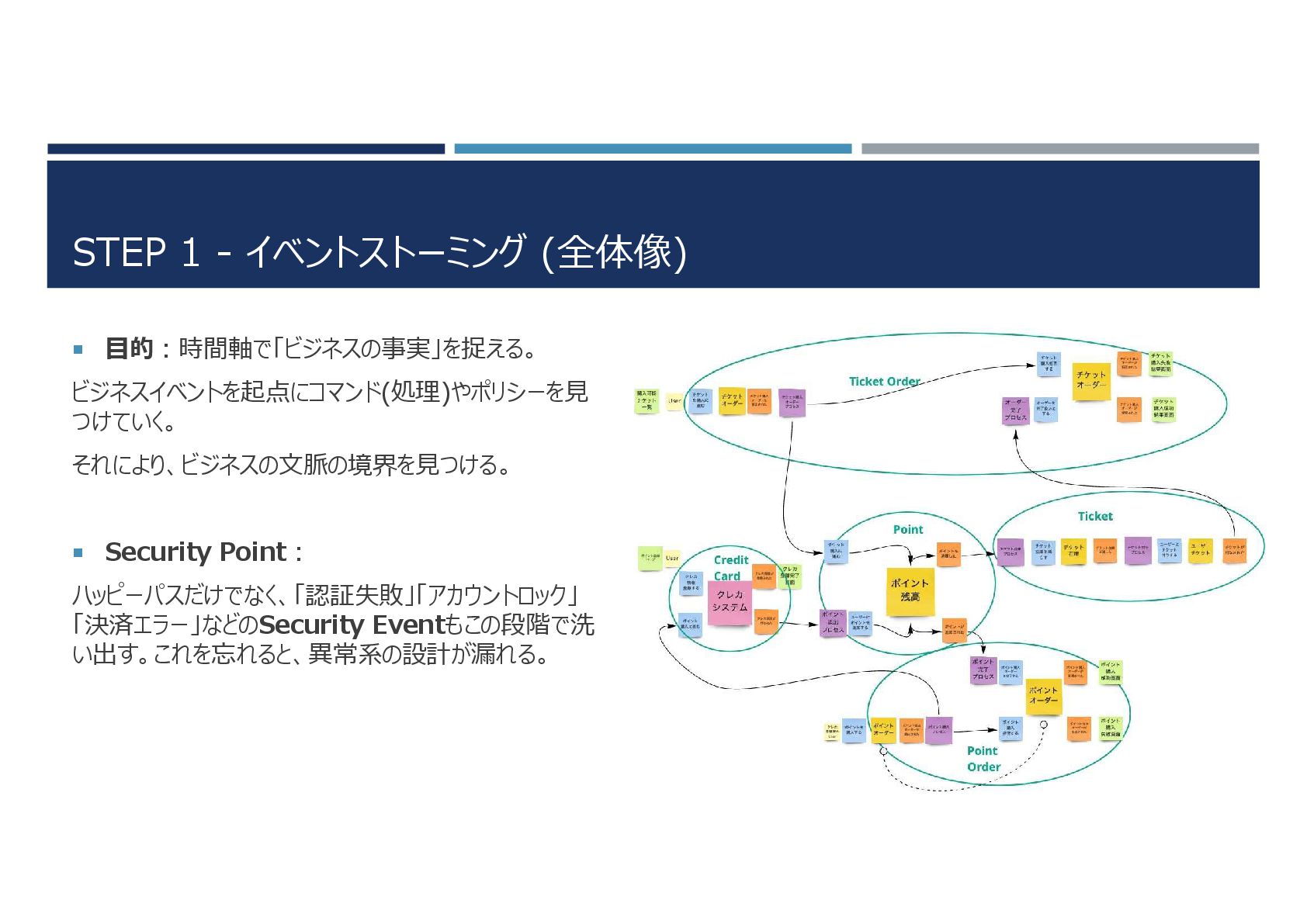 Security Point: ハッピーパスだけでなく、「認証失敗」「アカウントロック」 「決済エラー」などのSecurity Eventもこの段階で洗 い出す。これを忘れると、異常系の設計が漏れる。
