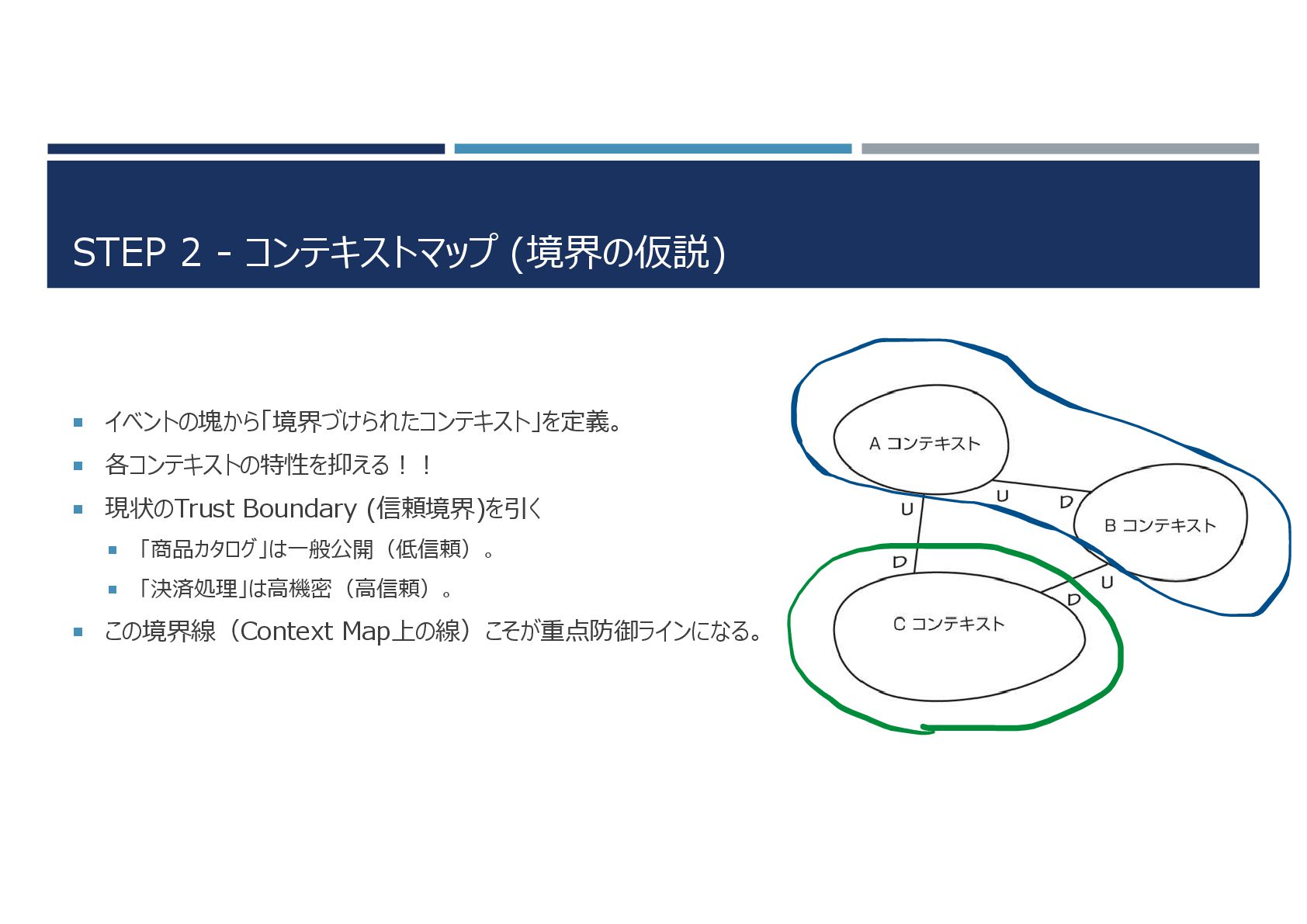 STEP 2 - コンテキストマップ (境界の仮説) イベントの塊から「境界づけられたコンテキスト」を定義。 各コンテキストの特性を抑える!!