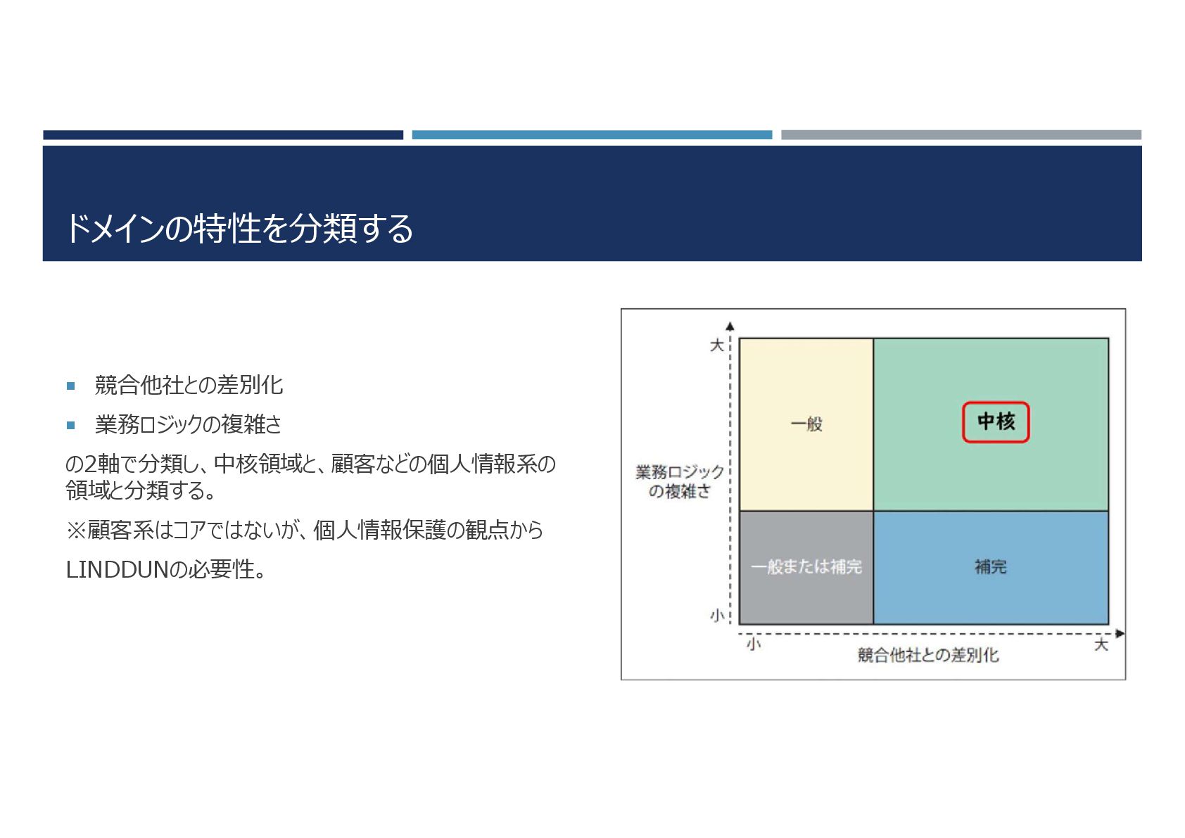 ドメインの特性を分類する 競合他社との差別化 業務ロジックの複雑さ の2軸で分類し、中核領域と、顧客などの個人情報系の 領域と分類する。 ※顧客系はコアではないが、個人情報保護の観点から LINDDUNの必要性。
