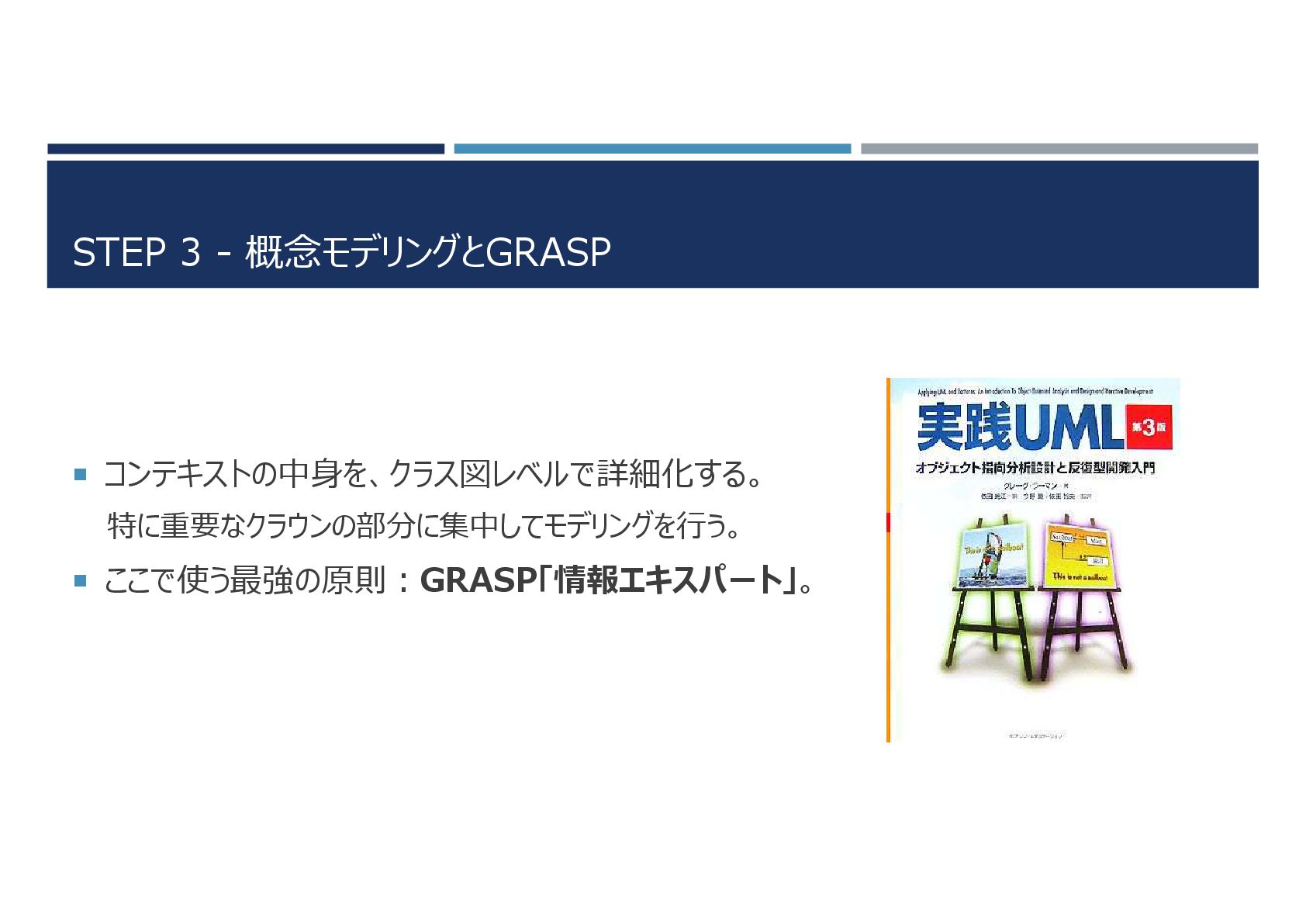 STEP 3 - 概念モデリングとGRASP コンテキストの中身を、クラス図レベルで詳細化する。 特に重要なクラウンの部分に集中してモデリングを行う。 ここで使う最強の原則:GRASP「情報エキスパート」。