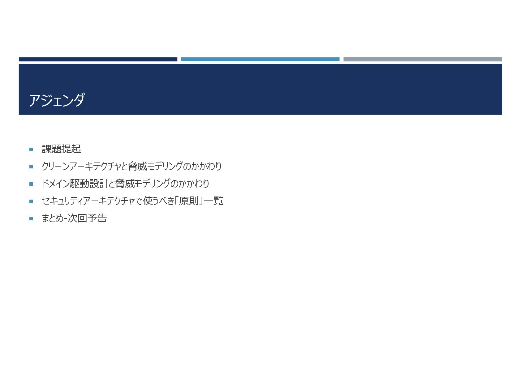 アジェンダ 課題提起 クリーンアーキテクチャと脅威モデリングのかかわり ドメイン駆動設計と脅威モデリングのかかわり セキュリティアーキテクチャで使うべき「原則」一覧