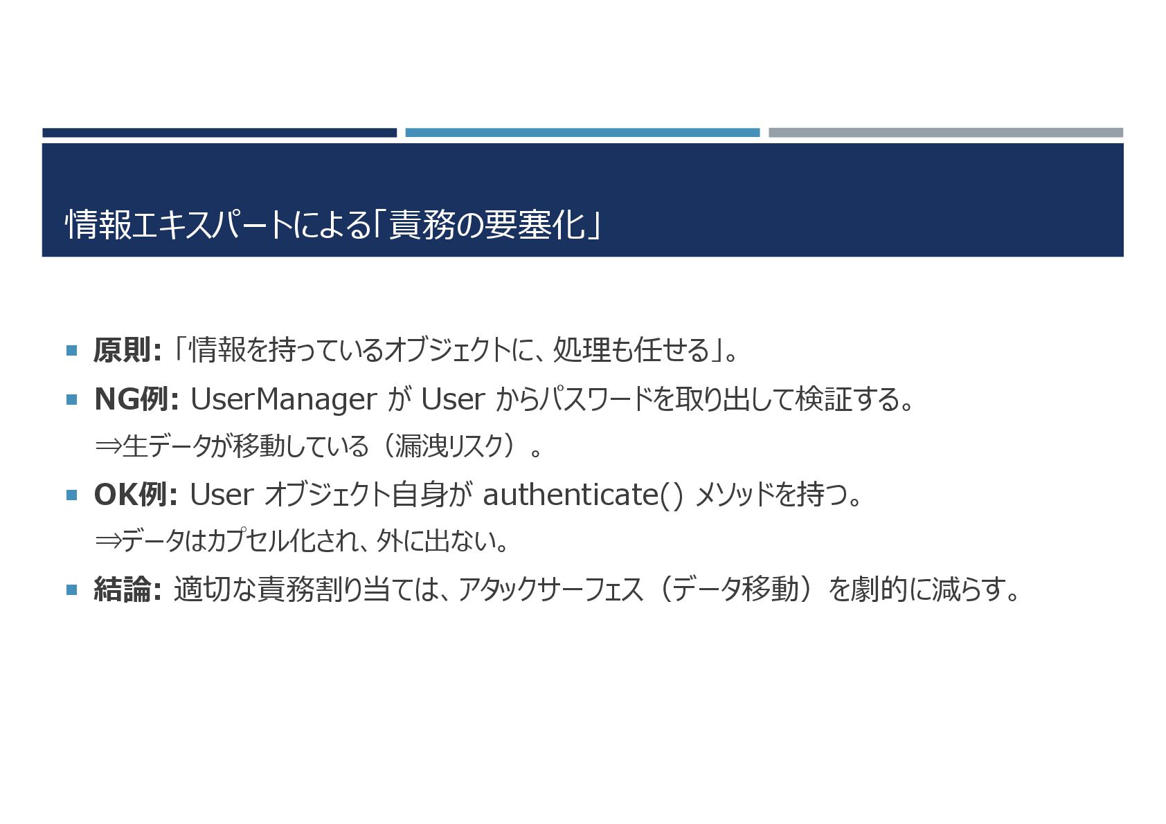 ⇒生データが移動している(漏洩リスク)。 OK例: User オブジェクト自身が authenticate() メソッドを持つ。 ⇒データはカプセル化され、外に出ない。 結論: 適切な責務割り当ては、アタックサーフェス(データ移動)を劇的に減らす。