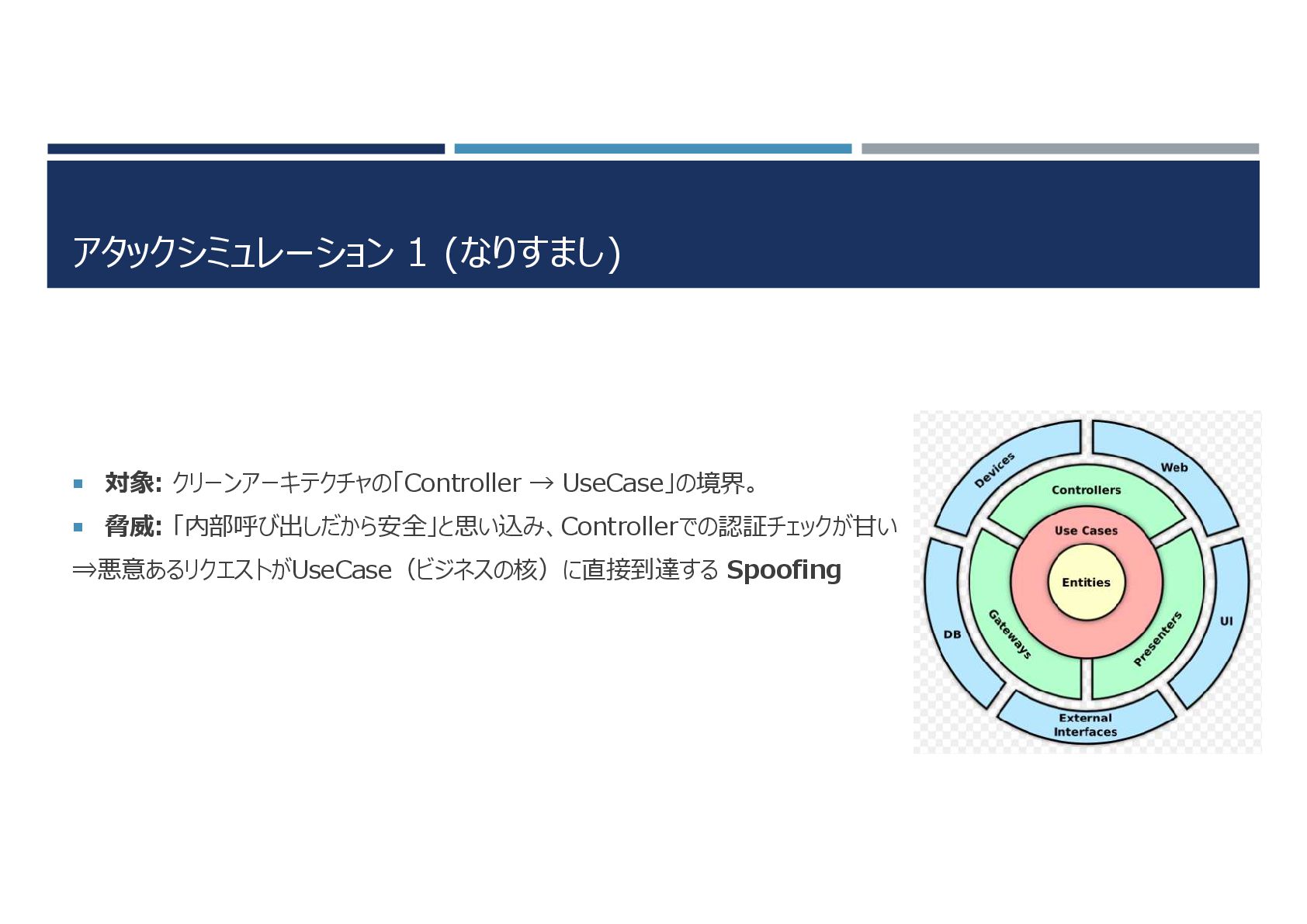 アタックシミュレーション 1 (なりすまし) 対象: クリーンアーキテクチャの「Controller → UseCase」の境界。 脅威: