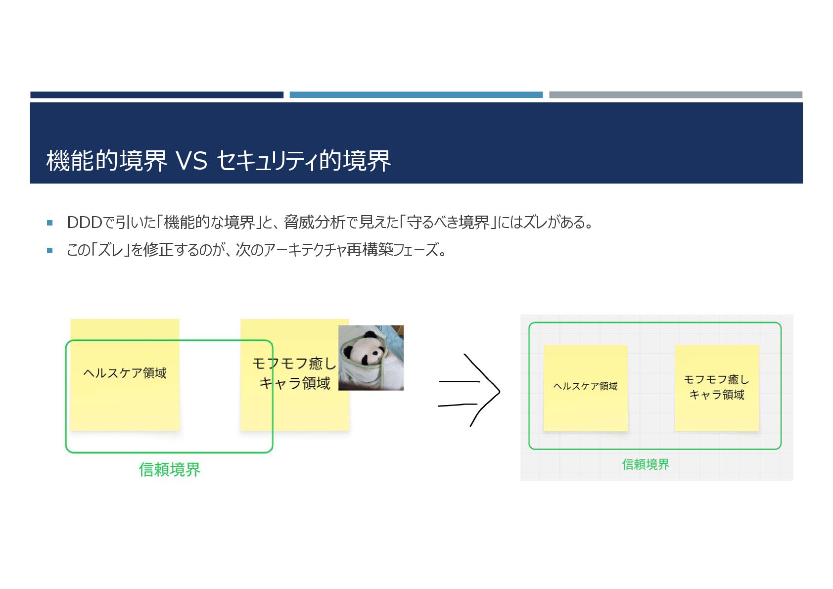 機能的境界 VS セキュリティ的境界 DDDで引いた「機能的な境界」と、脅威分析で見えた「守るべき境界」にはズレがある。 この「ズレ」を修正するのが、次のアーキテクチャ再構築フェーズ。