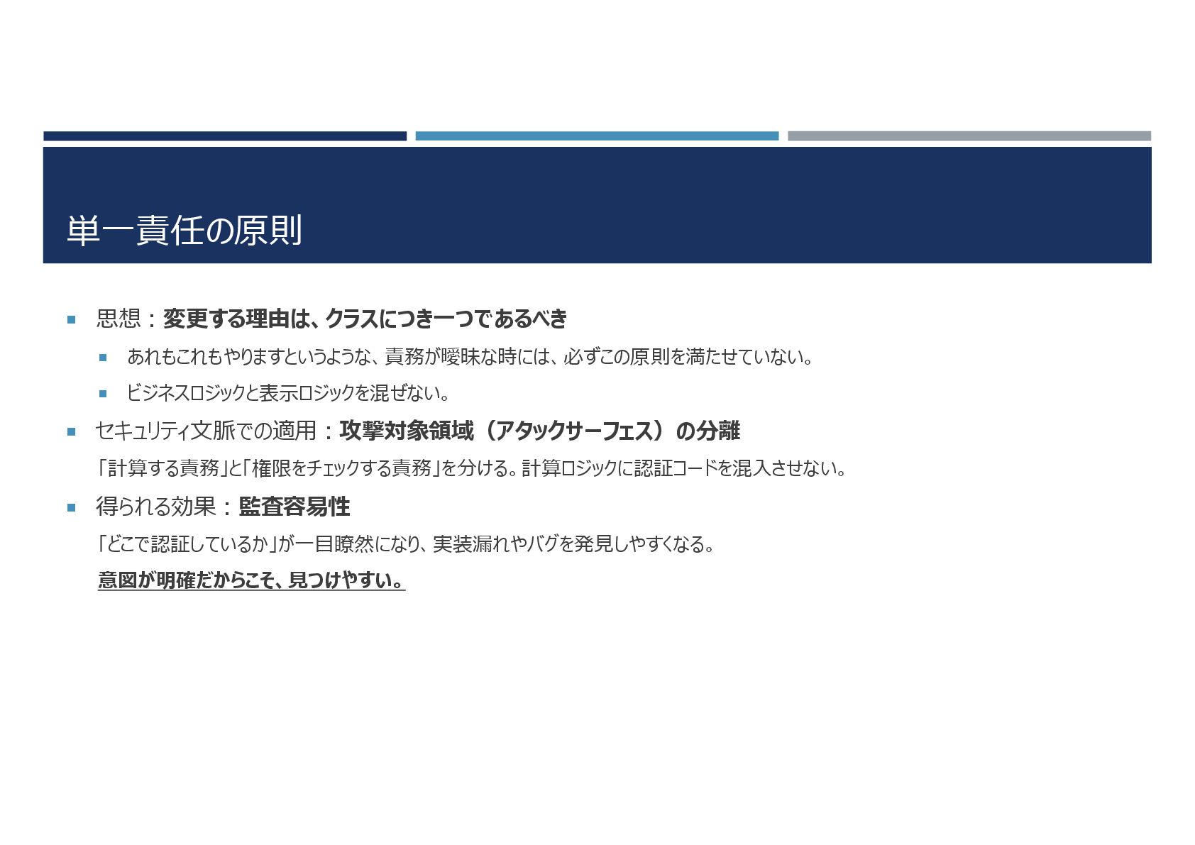 単一責任の原則 思想:変更する理由は、クラスにつき一つであるべき あれもこれもやりますというような、責務が曖昧な時には、必ずこの原則を満たせていない。 ビジネスロジックと表示ロジックを混ぜない。 セキュリティ文脈での適用:攻撃対象領域(アタックサーフェス)の分離 「計算する責務」と「権限をチェックする責務」を分ける。計算ロジックに認証コードを混入させない。