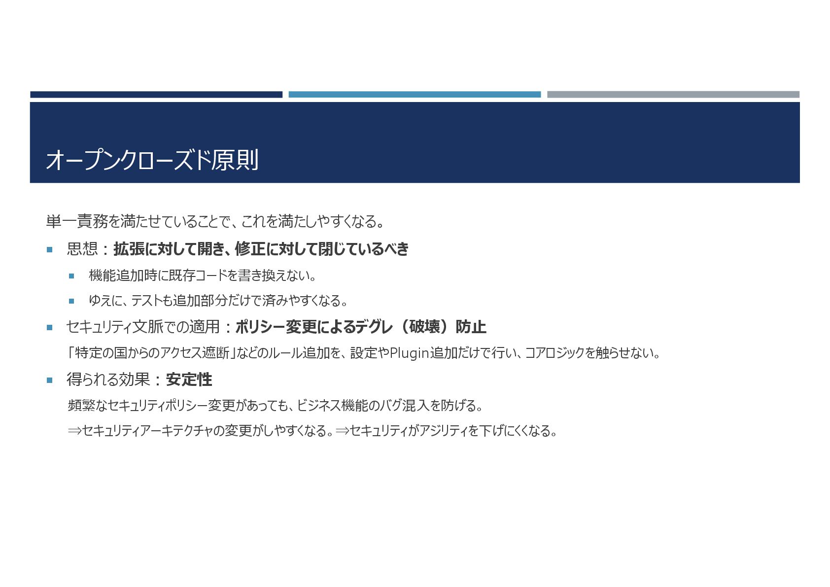 オープンクローズド原則 単一責務を満たせていることで、これを満たしやすくなる。 思想:拡張に対して開き、修正に対して閉じているべき 機能追加時に既存コードを書き換えない。 ゆえに、テストも追加部分だけで済みやすくなる。 セキュリティ文脈での適用:ポリシー変更によるデグレ(破壊)防止