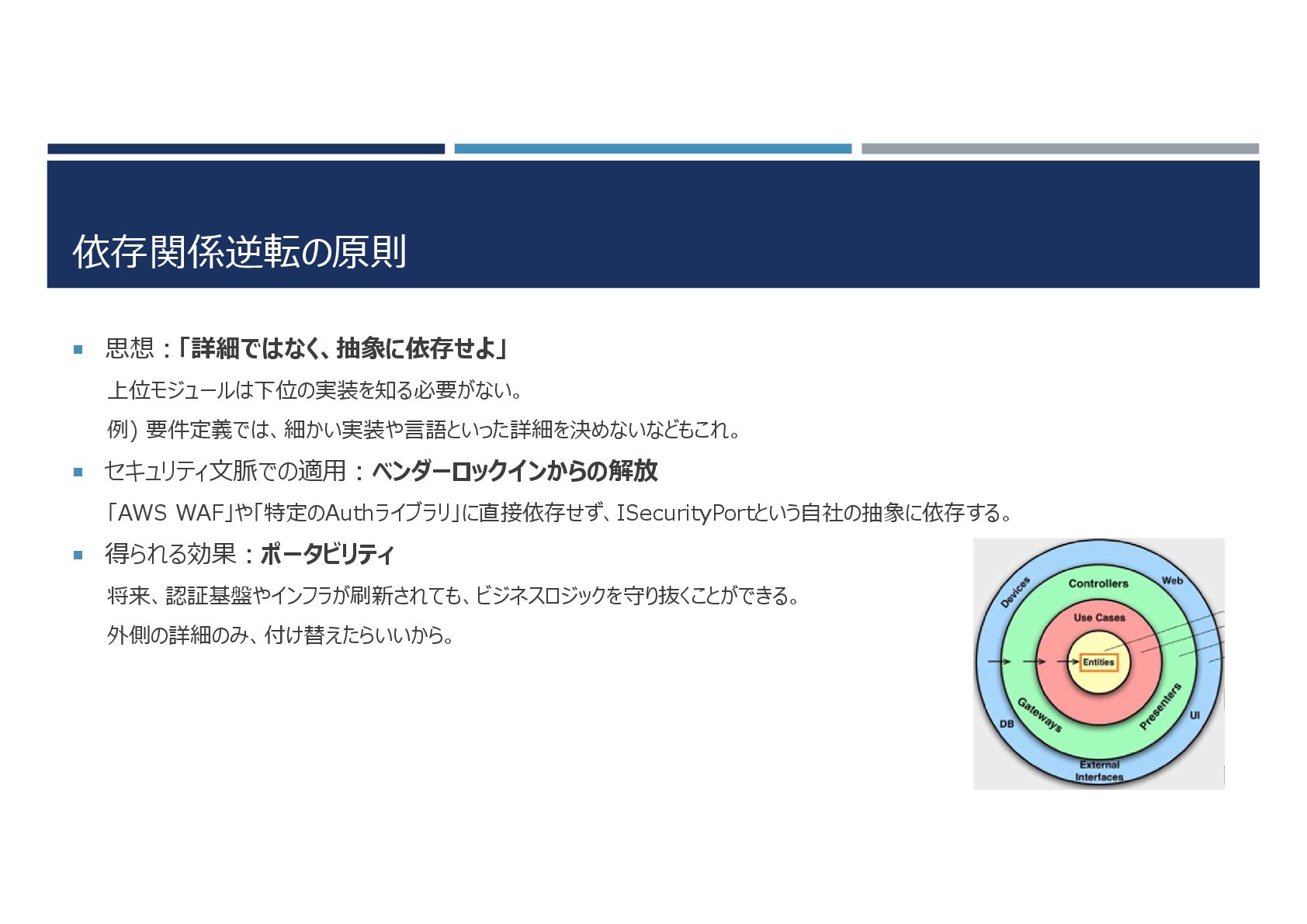 依存関係逆転の原則 思想:「詳細ではなく、抽象に依存せよ」 上位モジュールは下位の実装を知る必要がない。 例) 要件定義では、細かい実装や言語といった詳細を決めないなどもこれ。 セキュリティ文脈での適用:ベンダーロックインからの解放 「AWS WAF」や「特定のAuthライブラリ」に直接依存せず、ISecurityPortという自社の抽象に依存する。