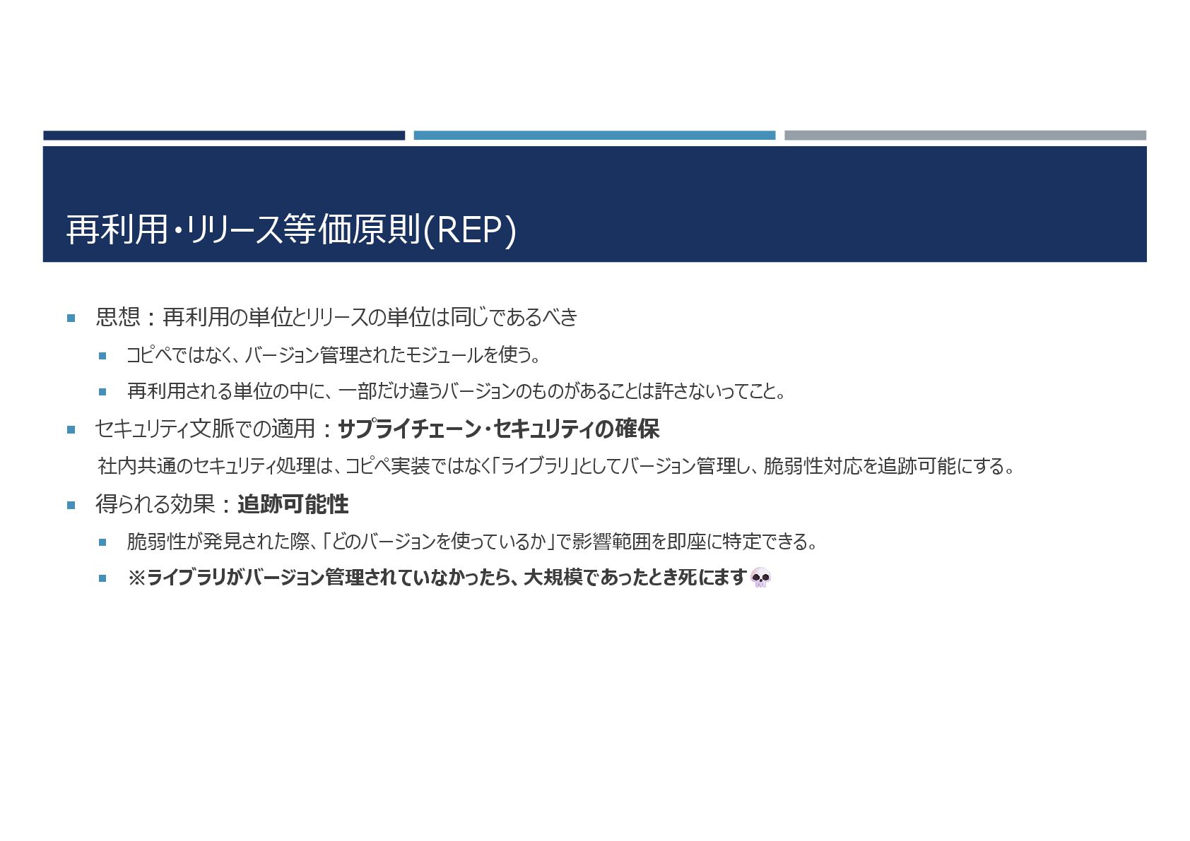 再利用・リリース等価原則(REP) 思想:再利用の単位とリリースの単位は同じであるべき コピペではなく、バージョン管理されたモジュールを使う。 再利用される単位の中に、一部だけ違うバージョンのものがあることは許さないってこと。 セキュリティ文脈での適用:サプライチェーン・セキュリティの確保 社内共通のセキュリティ処理は、コピペ実装ではなく「ライブラリ」としてバージョン管理し、脆弱性対応を追跡可能にする。