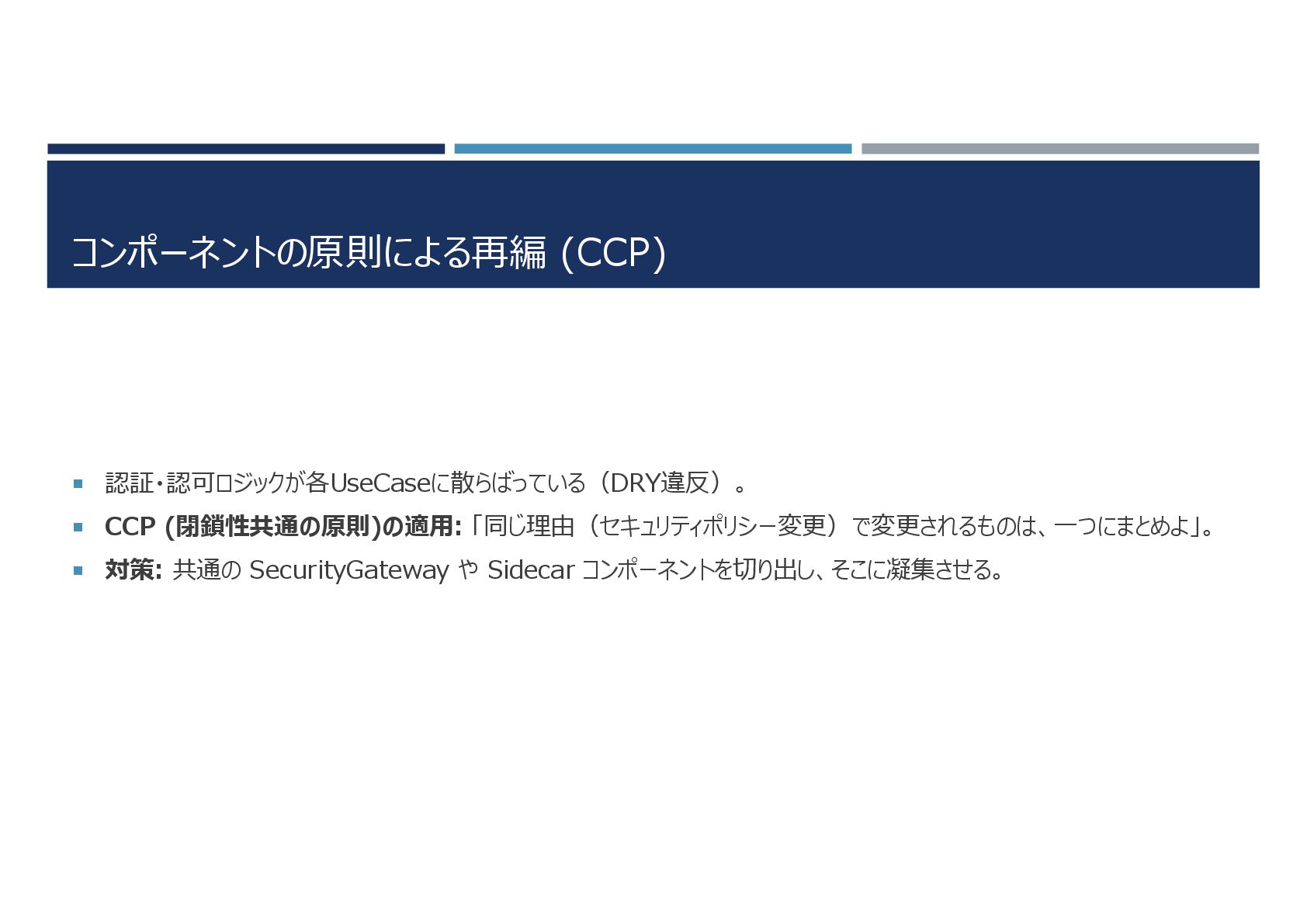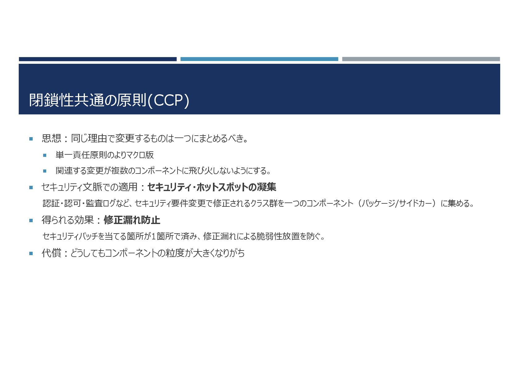 閉鎖性共通の原則(CCP) 思想:同じ理由で変更するものは一つにまとめるべき。 単一責任原則のよりマクロ版 関連する変更が複数のコンポーネントに飛び火しないようにする。 セキュリティ文脈での適用:セキュリティ・ホットスポットの凝集 認証・認可・監査ログなど、セキュリティ要件変更で修正されるクラス群を一つのコンポーネント(パッケージ/サイドカー)に集める。