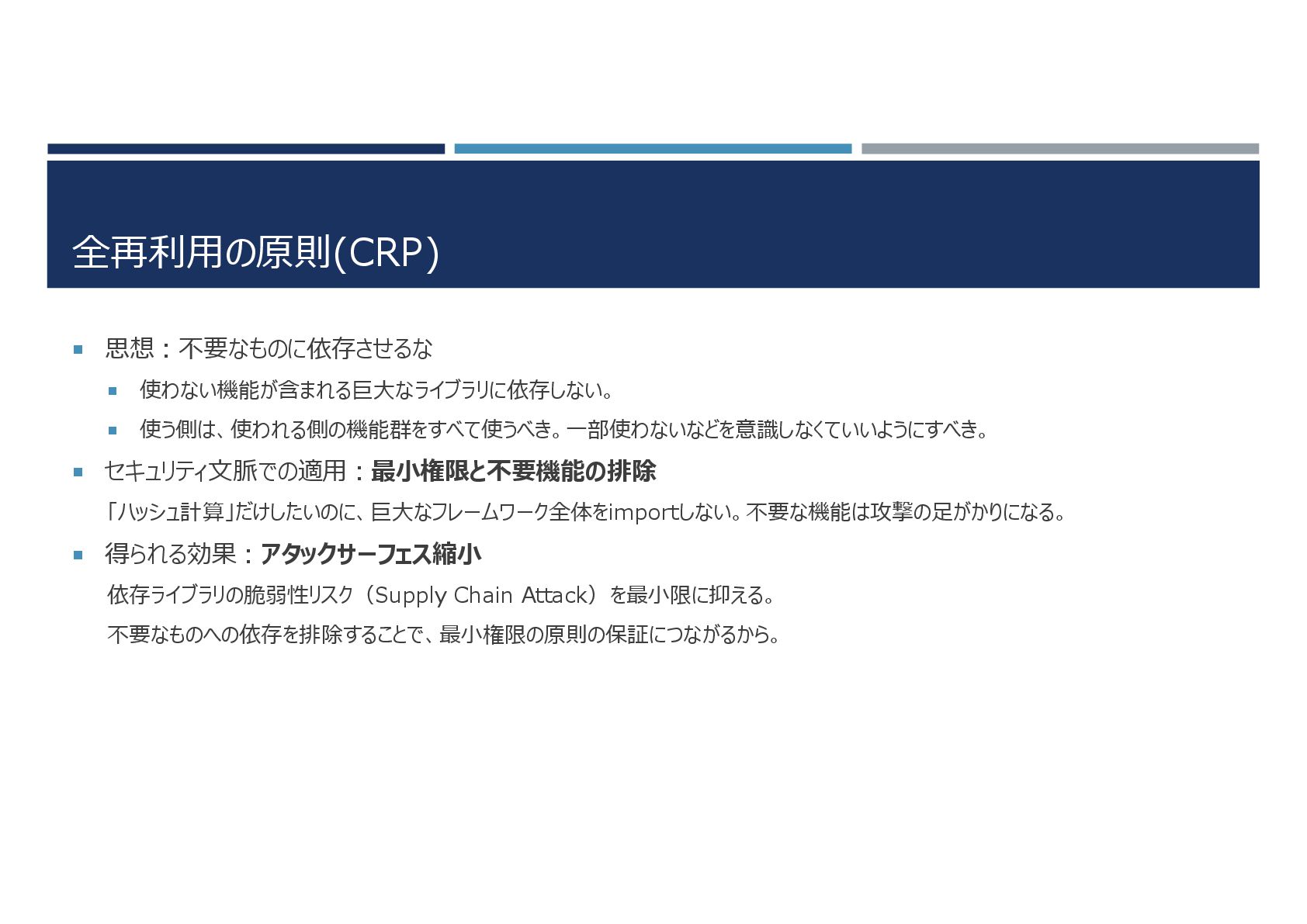全再利用の原則(CRP) 思想:不要なものに依存させるな 使わない機能が含まれる巨大なライブラリに依存しない。 使う側は、使われる側の機能群をすべて使うべき。一部使わないなどを意識しなくていいようにすべき。 セキュリティ文脈での適用:最小権限と不要機能の排除 「ハッシュ計算」だけしたいのに、巨大なフレームワーク全体をimportしない。不要な機能は攻撃の足がかりになる。