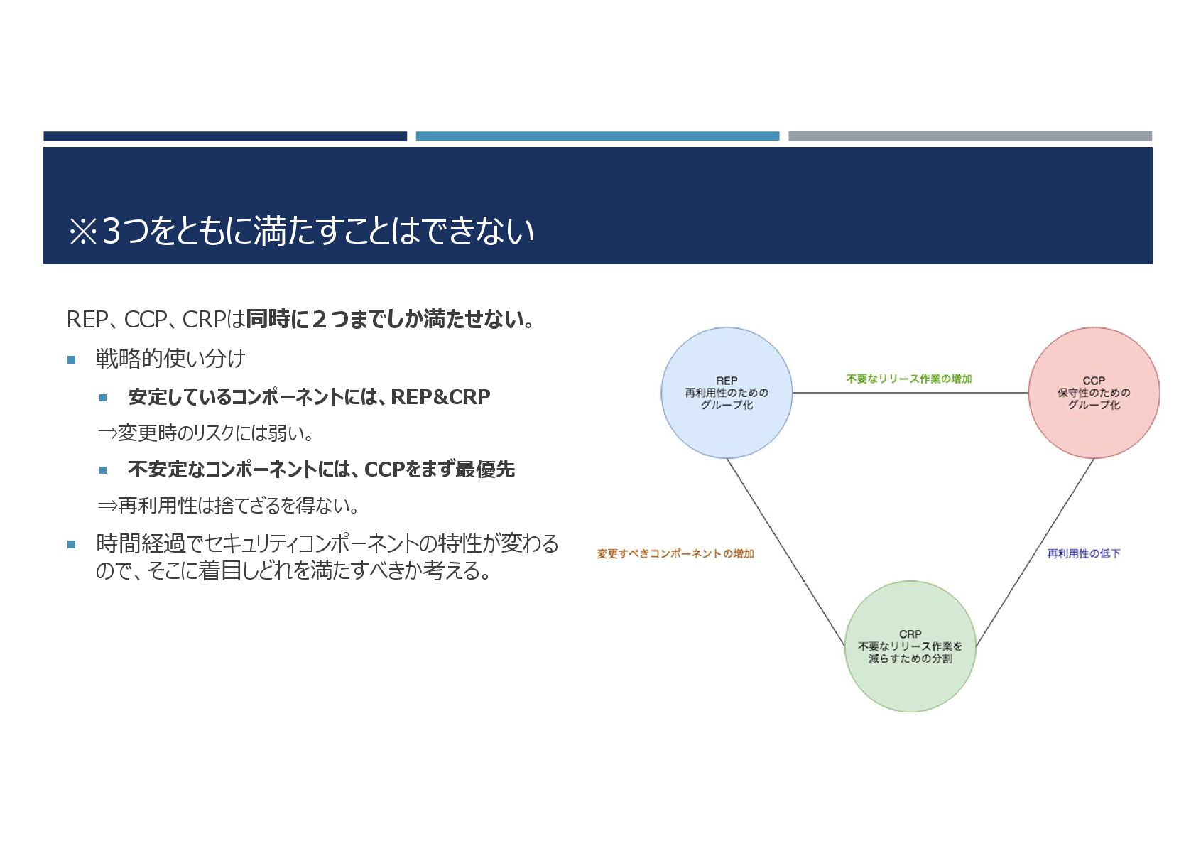 ※3つをともに満たすことはできない REP、CCP、CRPは同時に2つまでしか満たせない。 戦略的使い分け 安定しているコンポーネントには、REP&CRP ⇒変更時のリスクには弱い。 不安定なコンポーネントには、CCPをまず最優先 ⇒再利用性は捨てざるを得ない。