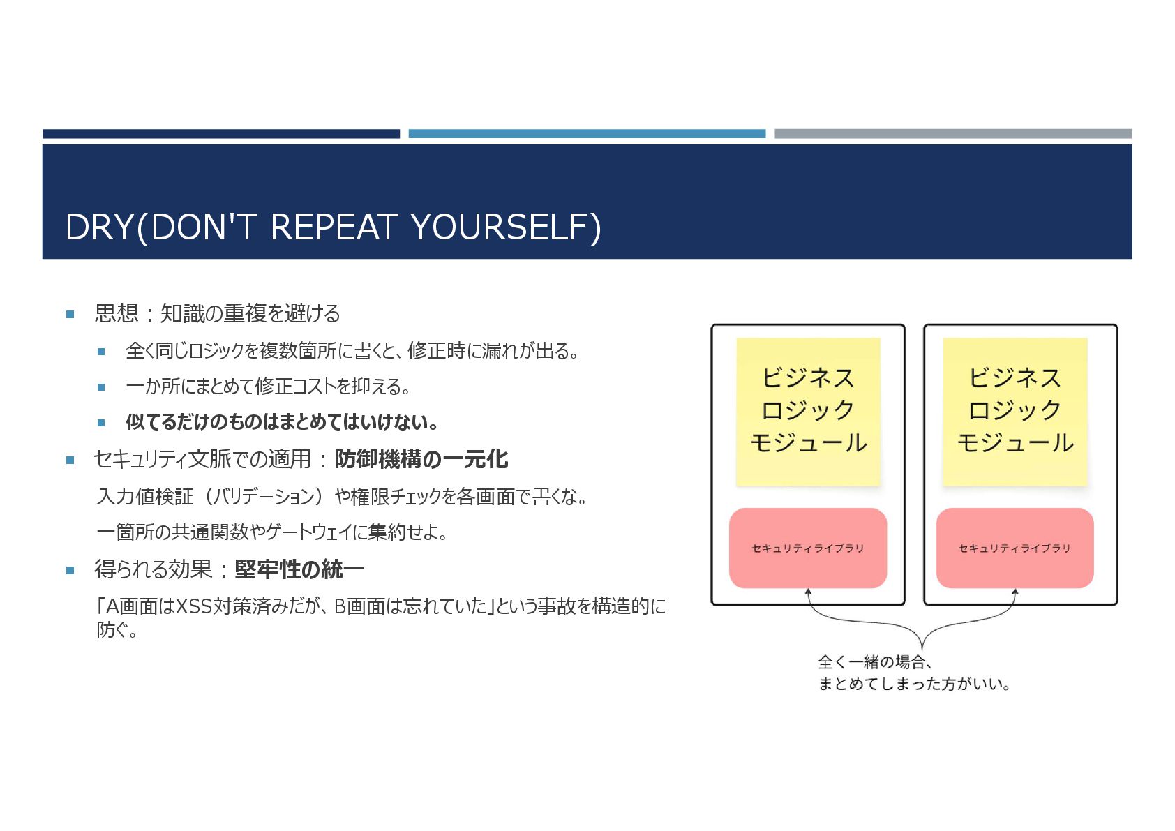 似てるだけのものはまとめてはいけない。 セキュリティ文脈での適用:防御機構の一元化 入力値検証(バリデーション)や権限チェックを各画面で書くな。 一箇所の共通関数やゲートウェイに集約せよ。 得られる効果:堅牢性の統一 「A画面はXSS対策済みだが、B画面は忘れていた」という事故を構造的に 防ぐ。