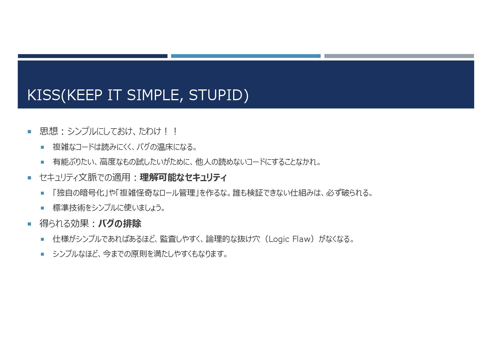 セキュリティ文脈での適用:理解可能なセキュリティ 「独自の暗号化」や「複雑怪奇なロール管理」を作るな。誰も検証できない仕組みは、必ず破られる。 標準技術をシンプルに使いましょう。 得られる効果:バグの排除 仕様がシンプルであればあるほど、監査しやすく、論理的な抜け穴(Logic Flaw)がなくなる。 シンプルなほど、今までの原則を満たしやすくもなります。
