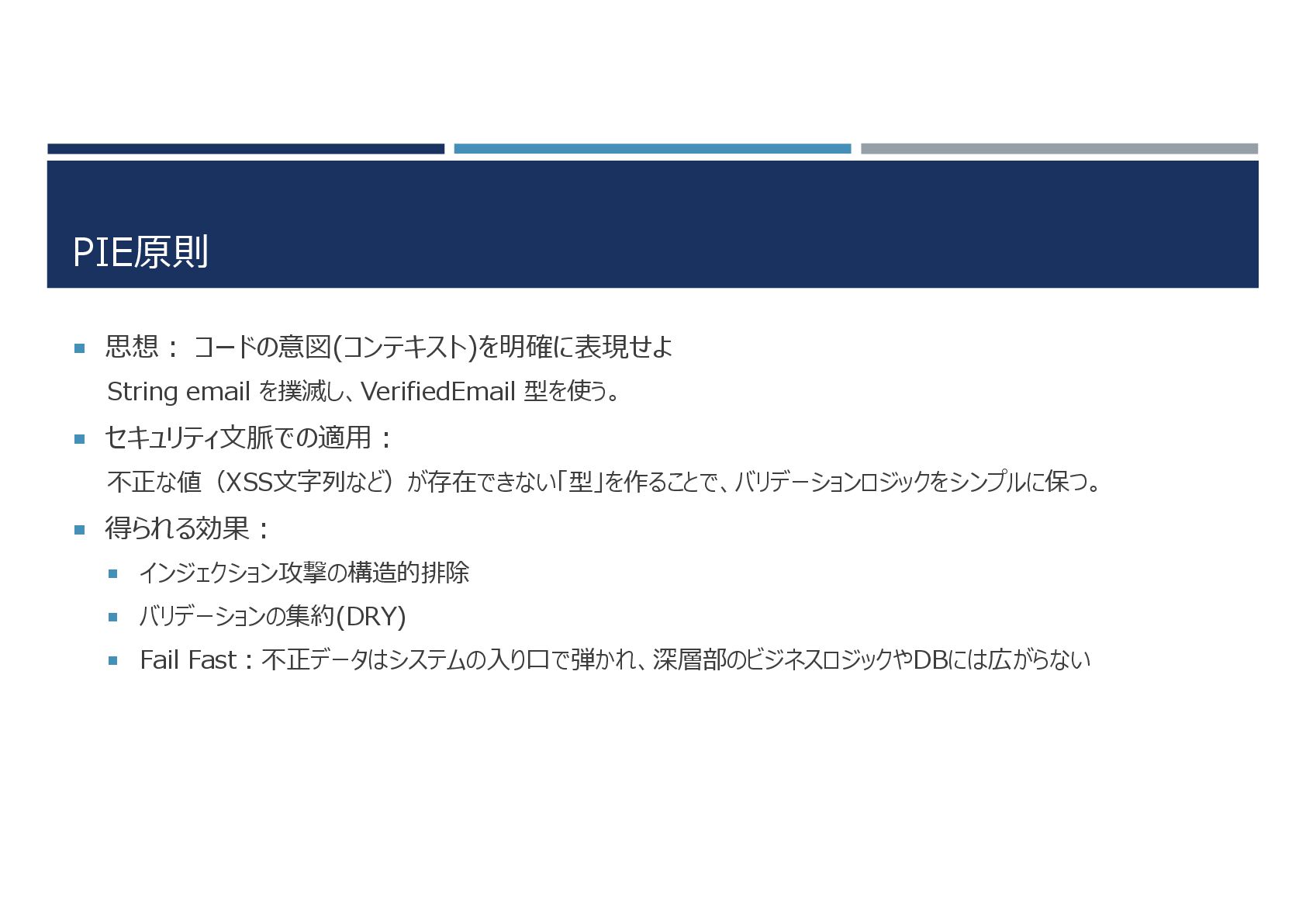 PIE原則 思想: コードの意図(コンテキスト)を明確に表現せよ String email を撲滅し、VerifiedEmail 型を使う。 セキュリティ文脈での適用: