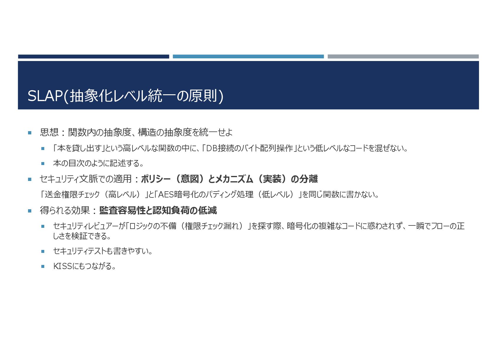 SLAP(抽象化レベル統一の原則) 思想:関数内の抽象度、構造の抽象度を統一せよ 「本を貸し出す」という高レベルな関数の中に、「DB接続のバイト配列操作」という低レベルなコードを混ぜない。 本の目次のように記述する。 セキュリティ文脈での適用:ポリシー(意図)とメカニズム(実装)の分離 「送金権限チェック(高レベル)」と「AES暗号化のパディング処理(低レベル)」を同じ関数に書かない。
