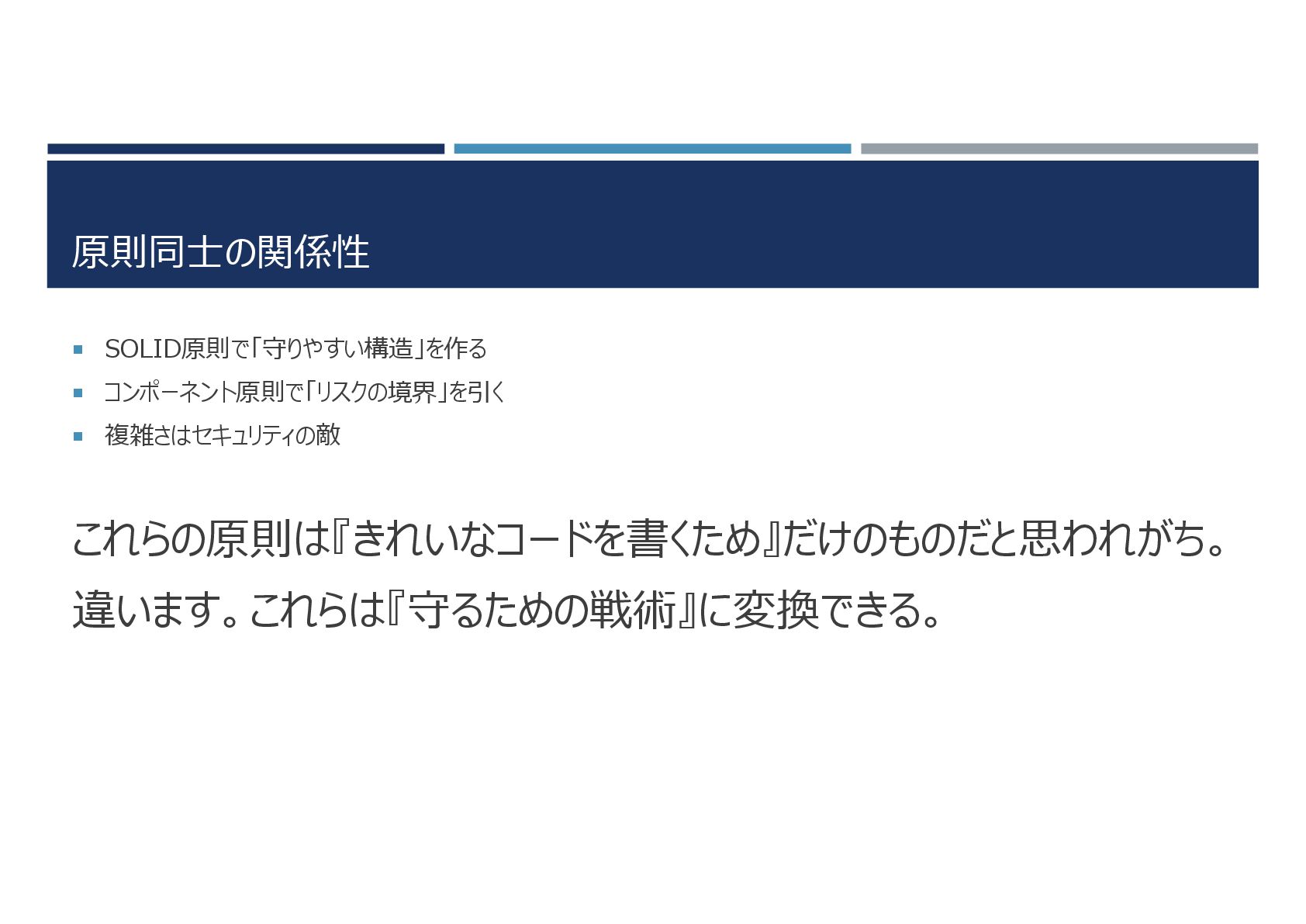 原則同士の関係性 SOLID原則で「守りやすい構造」を作る コンポーネント原則で「リスクの境界」を引く 複雑さはセキュリティの敵 これらの原則は『きれいなコードを書くため』だけのものだと思われがち。 違います。これらは『守るための戦術』に変換できる。