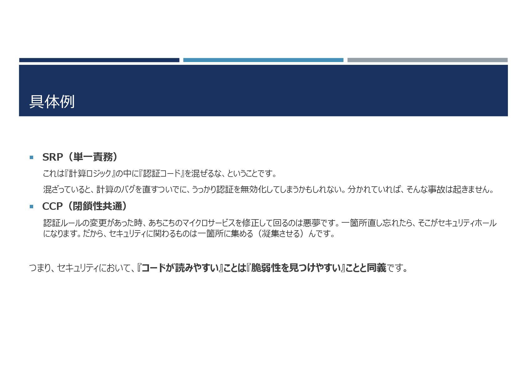 具体例 SRP(単一責務) これは『計算ロジック』の中に『認証コード』を混ぜるな、ということです。 混ざっていると、計算のバグを直すついでに、うっかり認証を無効化してしまうかもしれない。分かれていれば、そんな事故は起きません。 CCP(閉鎖性共通) 認証ルールの変更があった時、あちこちのマイクロサービスを修正して回るのは悪夢です。一箇所直し忘れたら、そこがセキュリティホール になります。だから、セキュリティに関わるものは一箇所に集める(凝集させる)んです。 つまり、セキュリティにおいて、『コードが読みやすい』ことは『脆弱性を見つけやすい』ことと同義です。