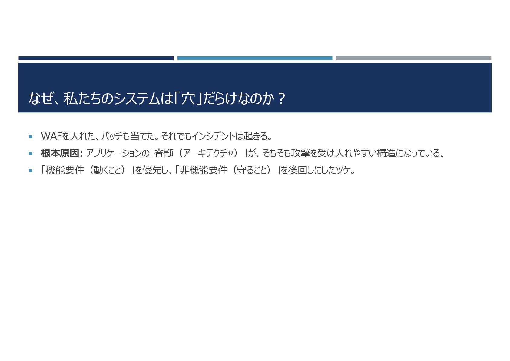 なぜ、私たちのシステムは「穴」だらけなのか? WAFを入れた、パッチも当てた。それでもインシデントは起きる。 根本原因: アプリケーションの「脊髄(アーキテクチャ)」が、そもそも攻撃を受け入れやすい構造になっている。 「機能要件(動くこと)」を優先し、「非機能要件(守ること)」を後回しにしたツケ。