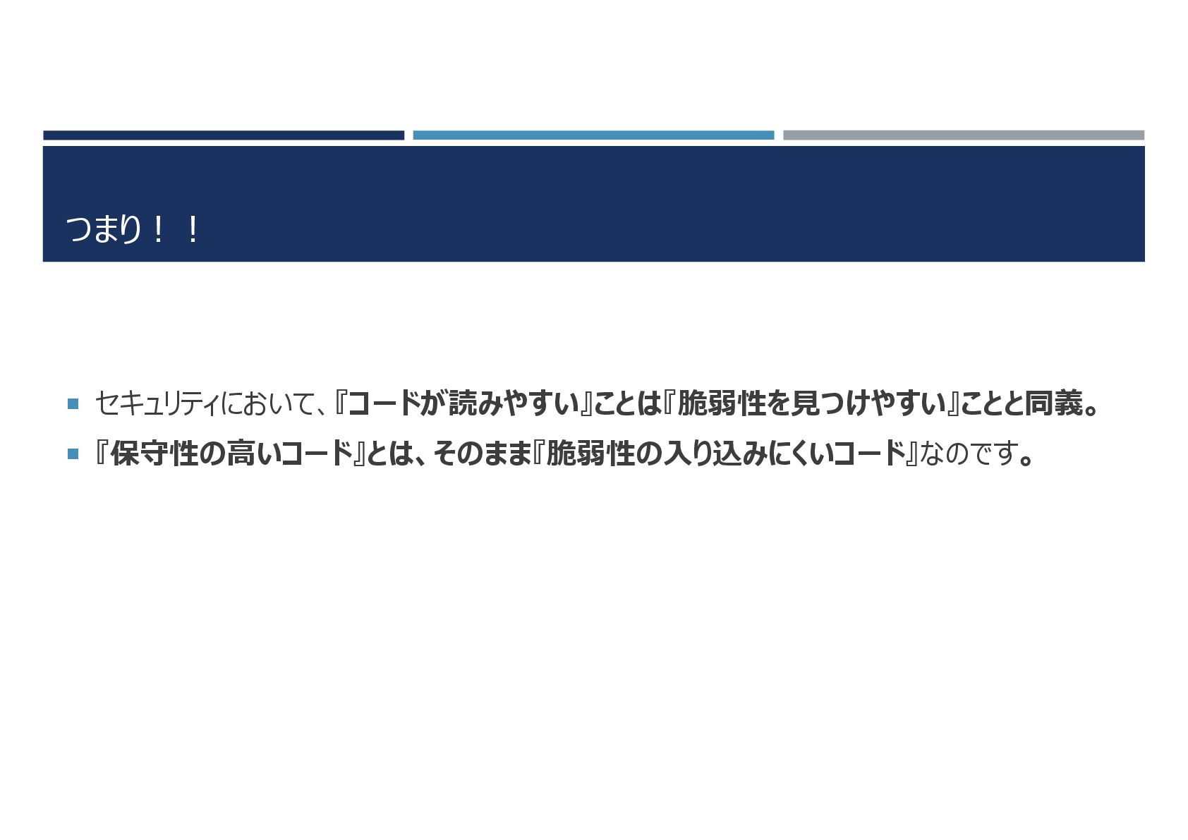 つまり!! セキュリティにおいて、『コードが読みやすい』ことは『脆弱性を見つけやすい』ことと同義。 『保守性の高いコード』とは、そのまま『脆弱性の入り込みにくいコード』なのです。