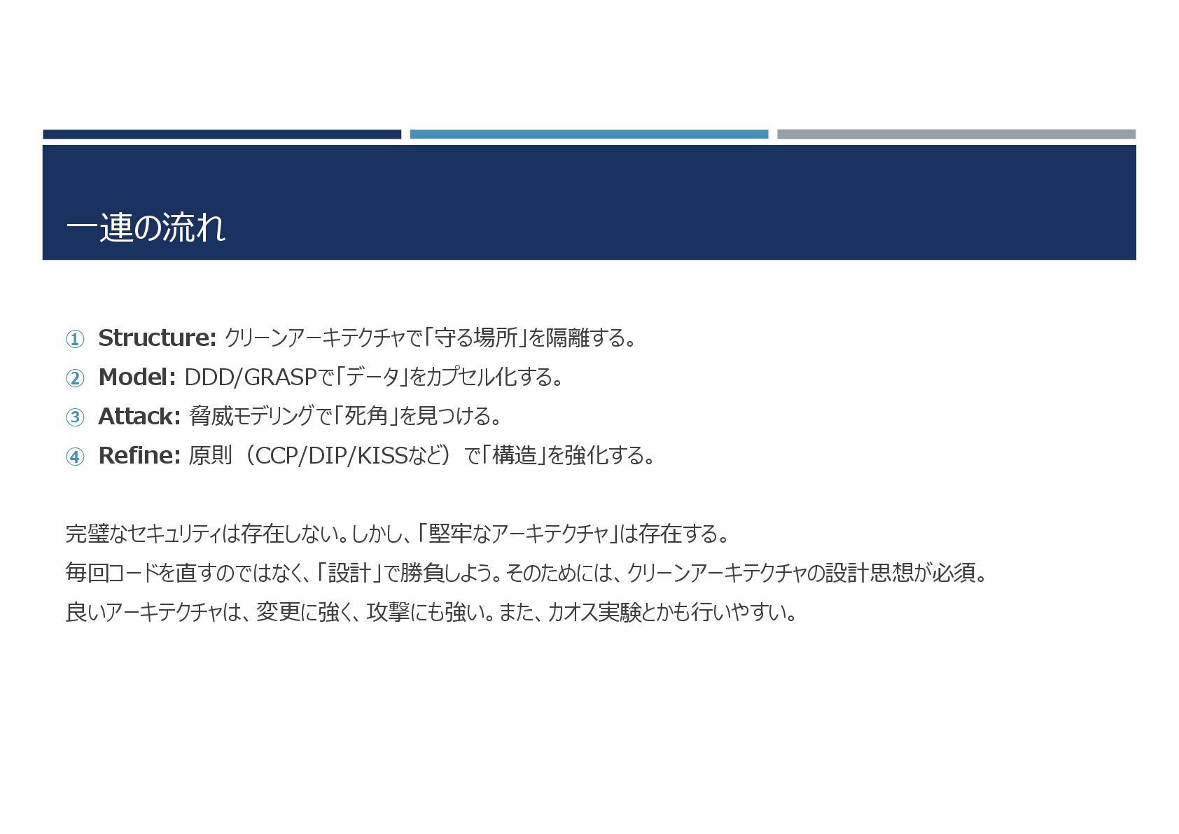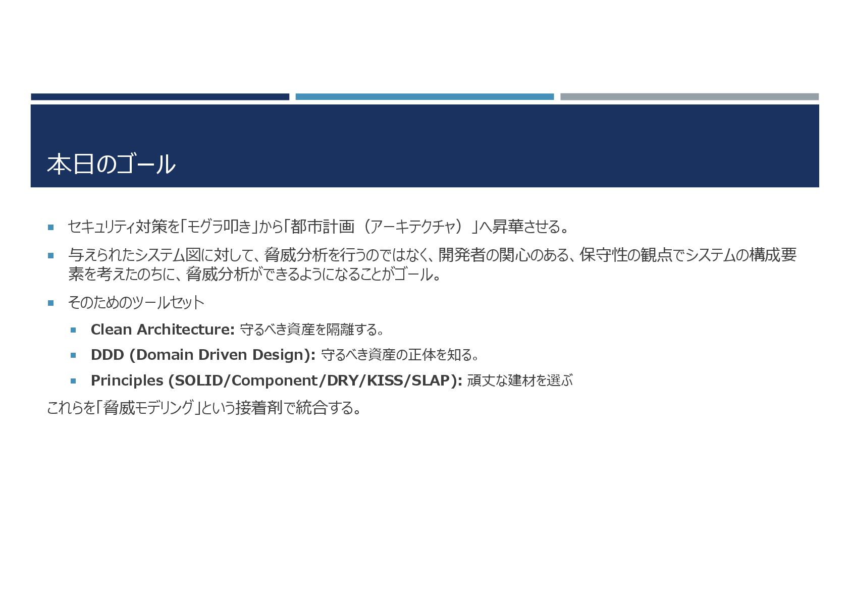 Architecture: 守るべき資産を隔離する。 DDD (Domain Driven Design): 守るべき資産の正体を知る。 Principles (SOLID/Component/DRY/KISS/SLAP): 頑丈な建材を選ぶ これらを「脅威モデリング」という接着剤で統合する。