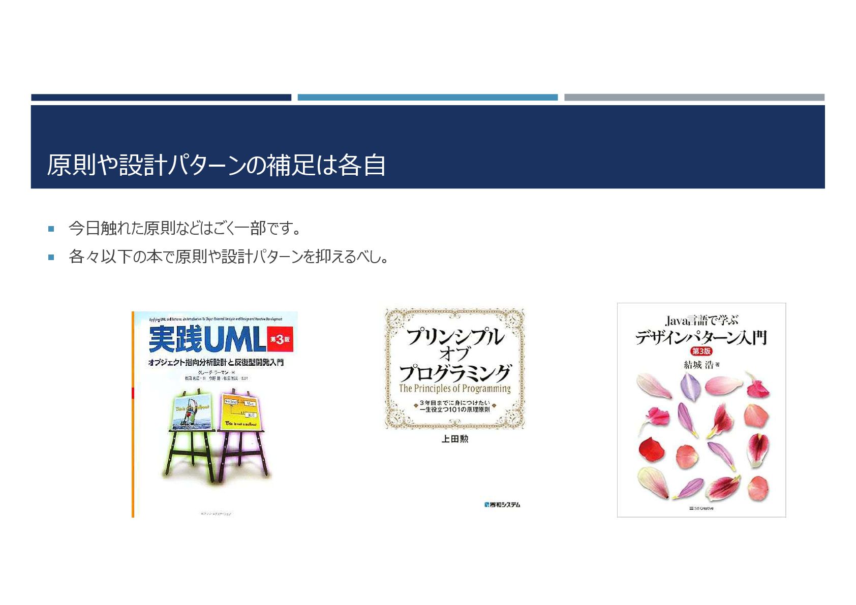 原則や設計パターンの補足は各自 今日触れた原則などはごく一部です。 各々以下の本で原則や設計パターンを抑えるべし。