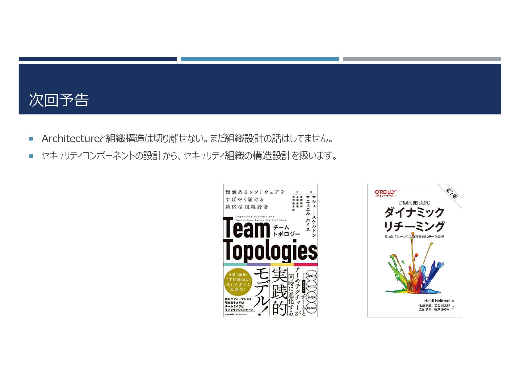 次回予告 Architectureと組織構造は切り離せない。まだ組織設計の話はしてません。 セキュリティコンポーネントの設計から、セキュリティ組織の構造設計を扱います。