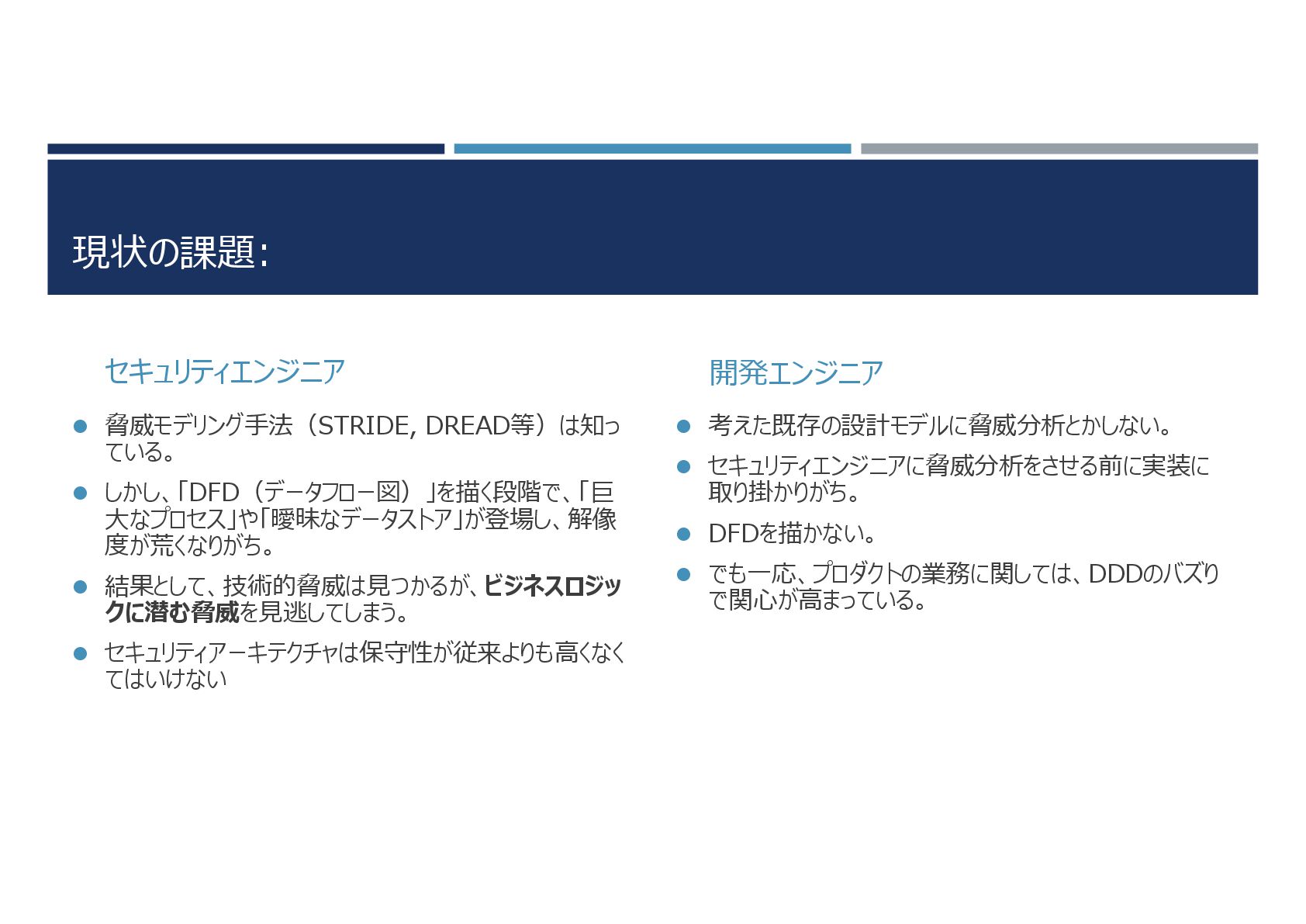 結果として、技術的脅威は見つかるが、ビジネスロジッ クに潜む脅威を見逃してしまう。 セキュリティアーキテクチャは保守性が従来よりも高くなく てはいけない 開発エンジニア 考えた既存の設計モデルに脅威分析とかしない。 セキュリティエンジニアに脅威分析をさせる前に実装に 取り掛かりがち。 DFDを描かない。 でも一応、プロダクトの業務に関しては、DDDのバズり で関心が高まっている。