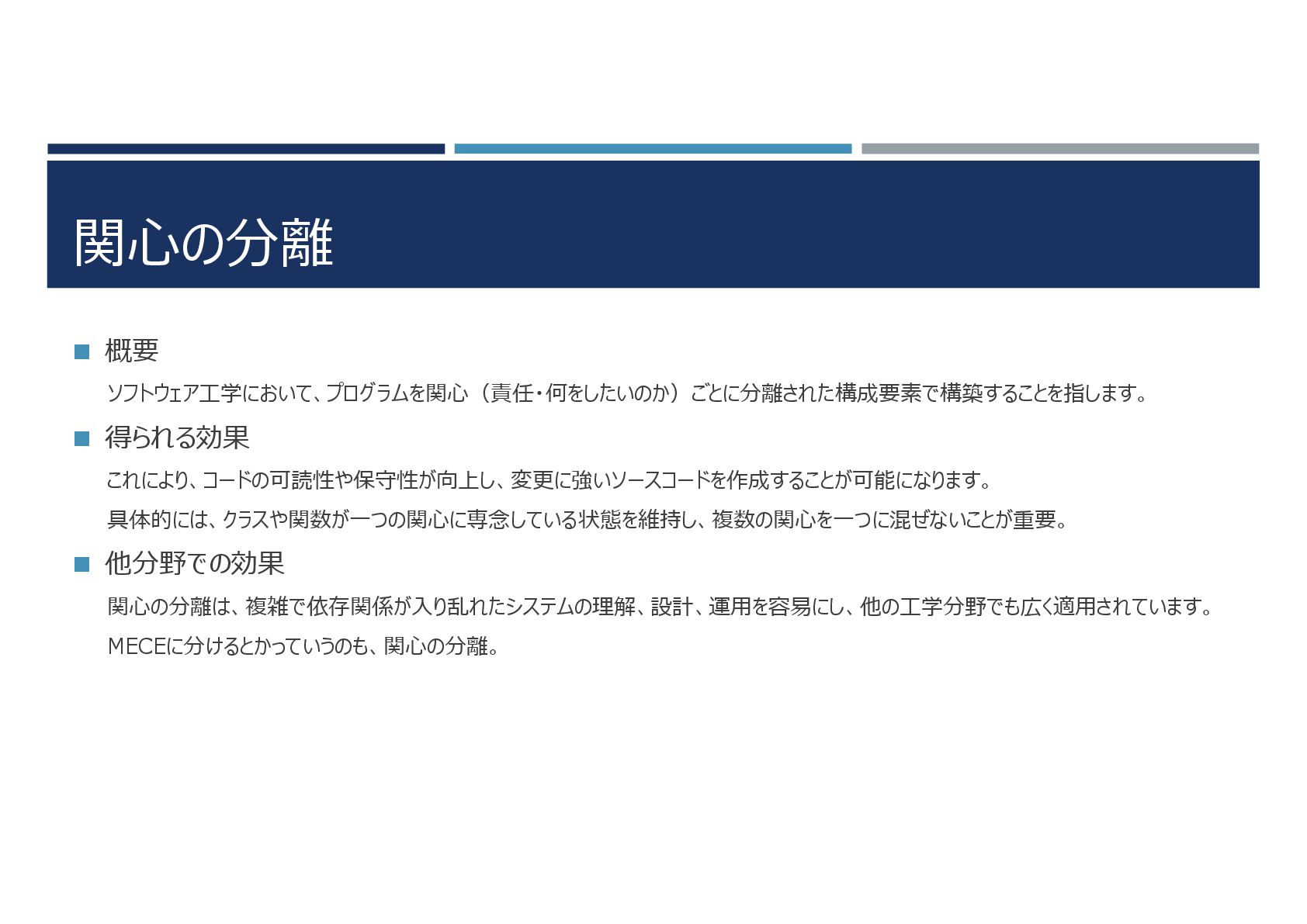 関心の分離 概要 ソフトウェア工学において、プログラムを関心(責任・何をしたいのか)ごとに分離された構成要素で構築することを指します。 得られる効果 これにより、コードの可読性や保守性が向上し、変更に強いソースコードを作成することが可能になります。 具体的には、クラスや関数が一つの関心に専念している状態を維持し、複数の関心を一つに混ぜないことが重要。 他分野での効果