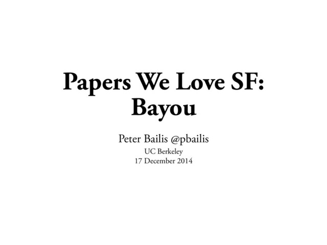 Peter (@pbailis) is a Ph.D. candidate at UC Berkeley, where he studies data management and distributed systems. Peter likes fast databases but likes fast and correct databases even more. You can find more information at: http://bailis.org/