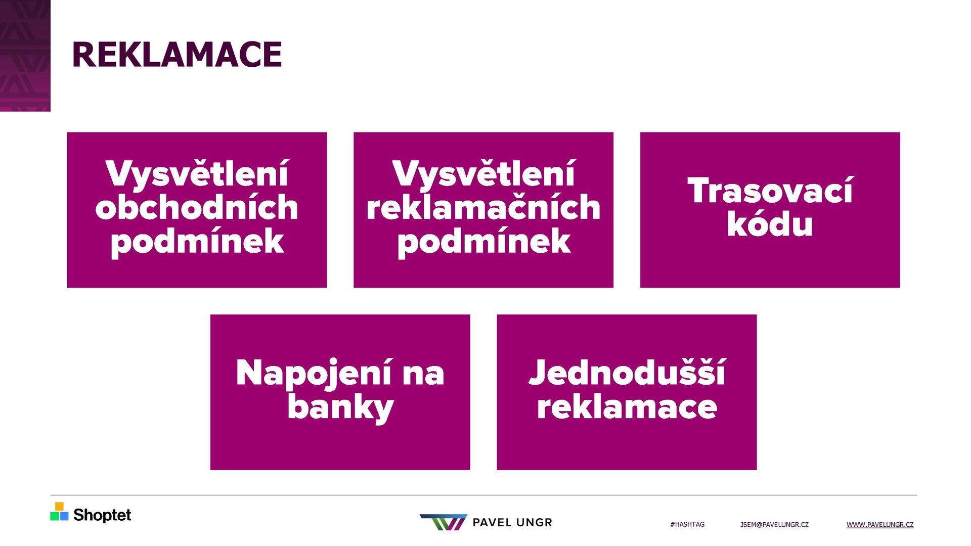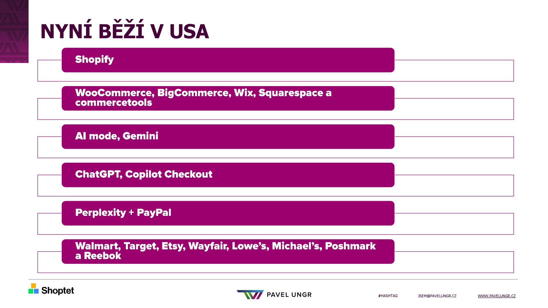 4. #HASHTAG [email protected] WWW.PAVELUNGR.CZ NYNÍ BĚŽÍ V USA Shopify WooCommerce ,