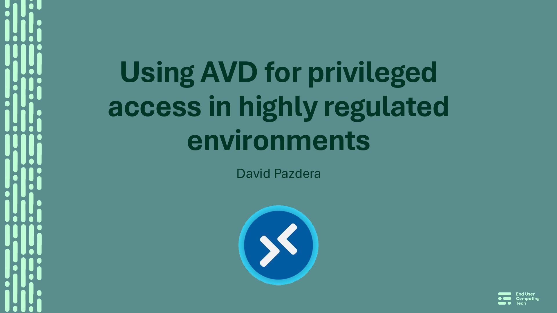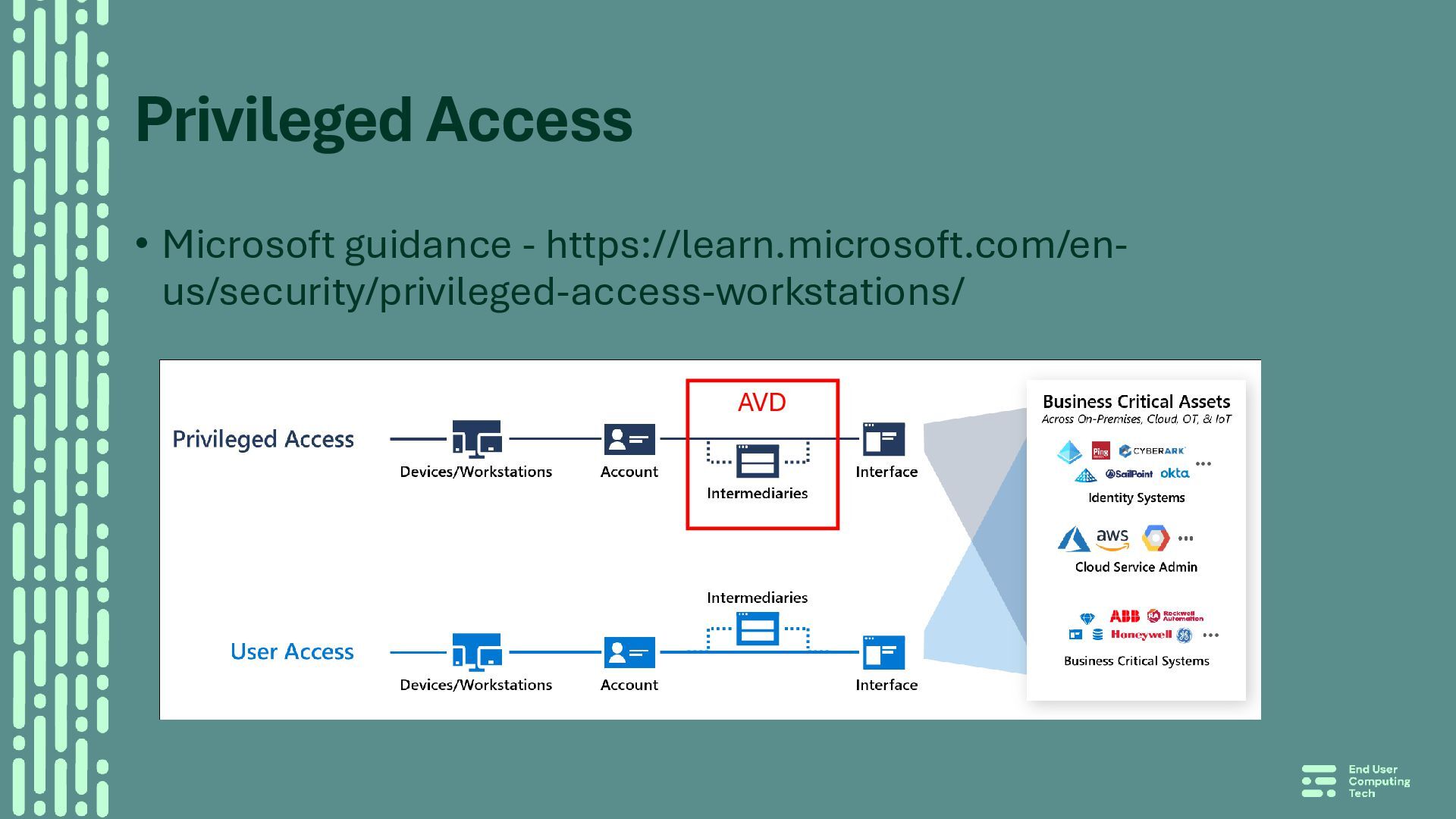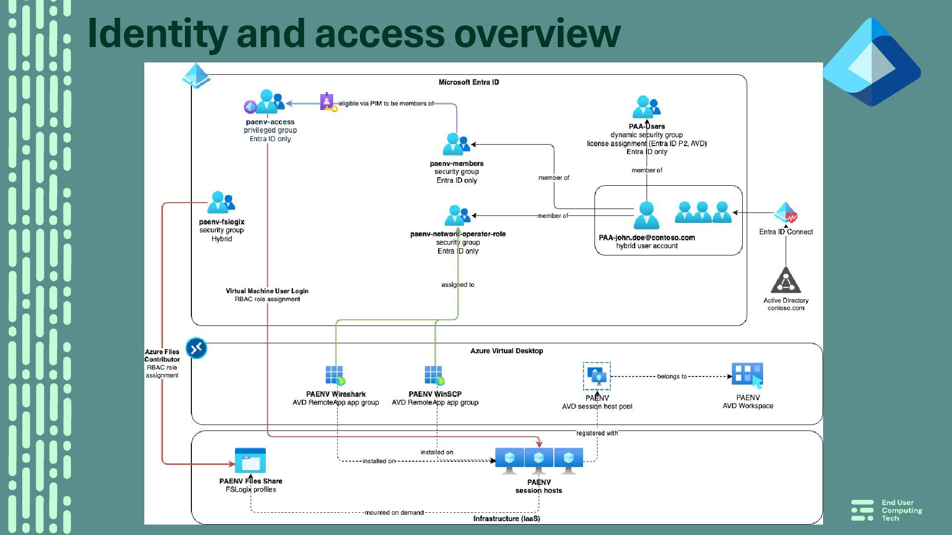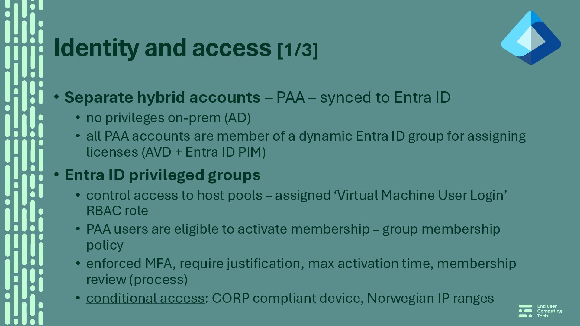 – synced to Entra ID • no privileges on-prem (AD) • all PAA accounts are member of a dynamic Entra ID group for assigning licenses (AVD + Entra ID PIM) • Entra ID privileged groups • control access to host pools – assigned ‘Virtual Machine User Login’ RBAC role • PAA users are eligible to activate membership – group membership policy • enforced MFA, require justification, max activation time, membership review (process) • conditional access: CORP compliant device, Norwegian IP ranges