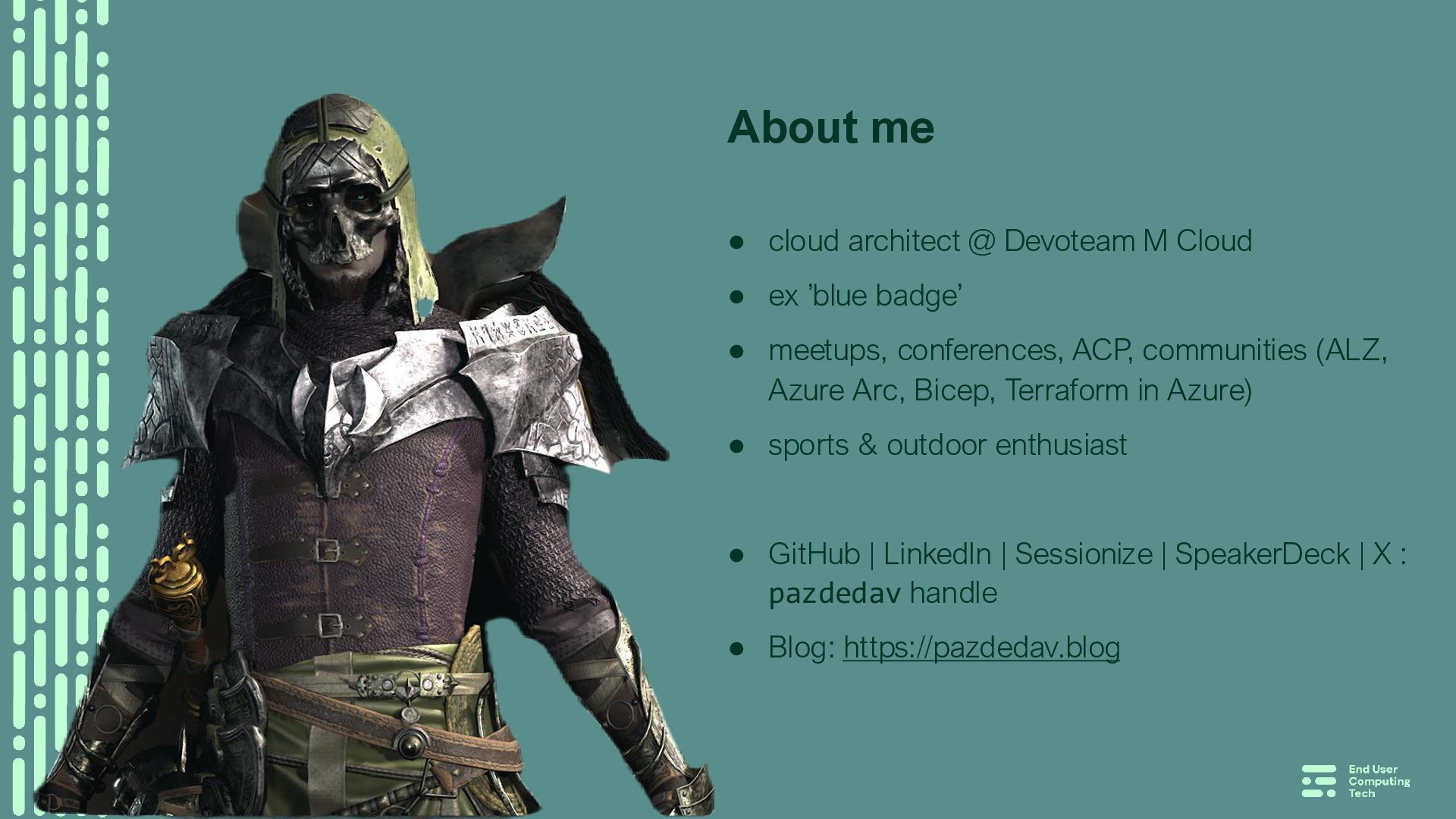 badge’ • meetups, conferences, ACP, communities (ALZ, Azure Arc, Bicep, Terraform in Azure) • sports & outdoor enthusiast • GitHub | LinkedIn | Sessionize | SpeakerDeck | X : pazdedav handle • Blog: https://pazdedav.blog About me