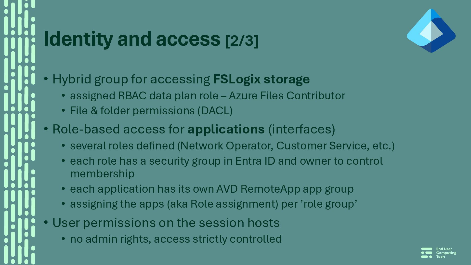 storage • assigned RBAC data plan role – Azure Files Contributor • File & folder permissions (DACL) • Role-based access for applications (interfaces) • several roles defined (Network Operator, Customer Service, etc.) • each role has a security group in Entra ID and owner to control membership • each application has its own AVD RemoteApp app group • assigning the apps (aka Role assignment) per ’role group’ • User permissions on the session hosts • no admin rights, access strictly controlled