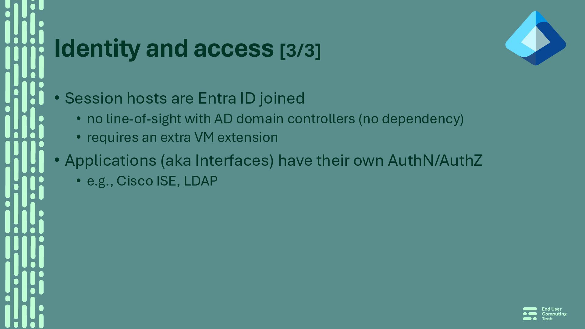 joined • no line-of-sight with AD domain controllers (no dependency) • requires an extra VM extension • Applications (aka Interfaces) have their own AuthN/AuthZ • e.g., Cisco ISE, LDAP