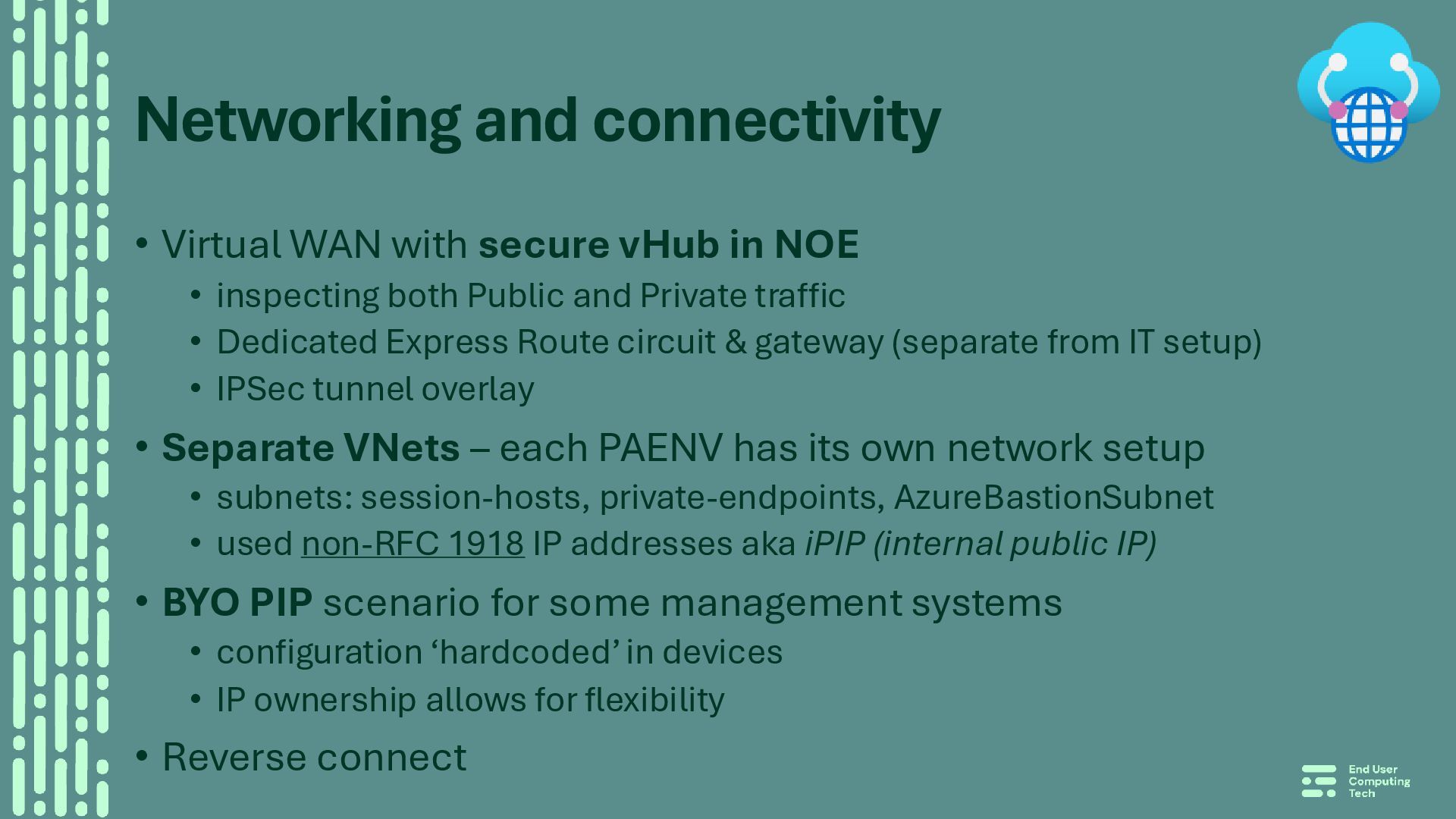 NOE • inspecting both Public and Private traffic • Dedicated Express Route circuit & gateway (separate from IT setup) • IPSec tunnel overlay • Separate VNets – each PAENV has its own network setup • subnets: session-hosts, private-endpoints, AzureBastionSubnet • used non-RFC 1918 IP addresses aka iPIP (internal public IP) • BYO PIP scenario for some management systems • configuration ‘hardcoded’ in devices • IP ownership allows for flexibility • Reverse connect