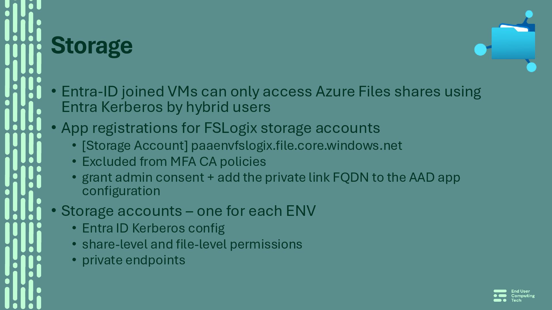 shares using Entra Kerberos by hybrid users • App registrations for FSLogix storage accounts • [Storage Account] paaenvfslogix.file.core.windows.net • Excluded from MFA CA policies • grant admin consent + add the private link FQDN to the AAD app configuration • Storage accounts – one for each ENV • Entra ID Kerberos config • share-level and file-level permissions • private endpoints