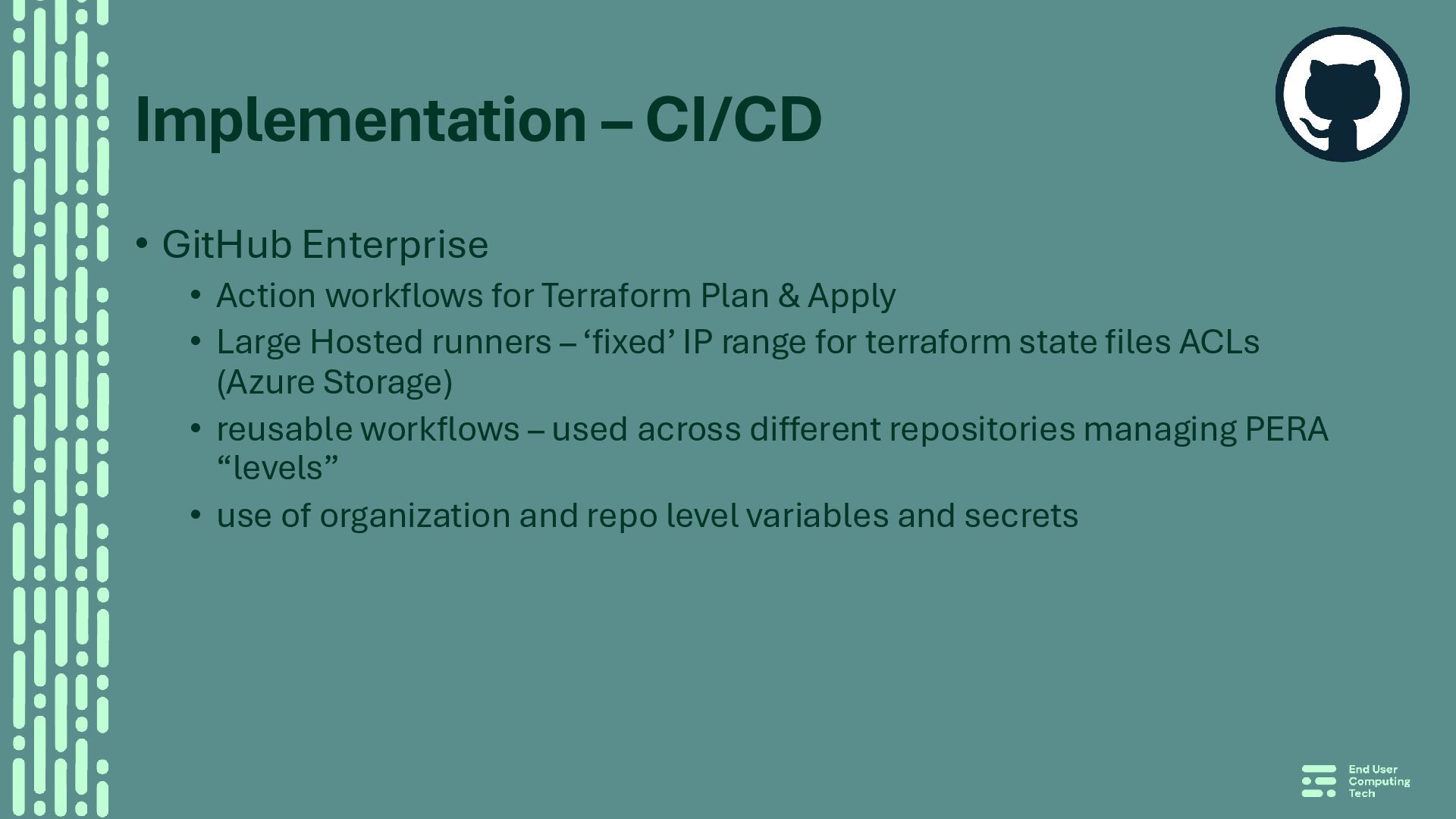 Terraform Plan & Apply • Large Hosted runners – ‘fixed’ IP range for terraform state files ACLs (Azure Storage) • reusable workflows – used across different repositories managing PERA “levels” • use of organization and repo level variables and secrets