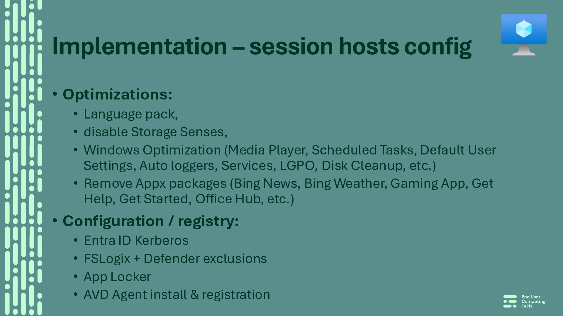 • disable Storage Senses, • Windows Optimization (Media Player, Scheduled Tasks, Default User Settings, Auto loggers, Services, LGPO, Disk Cleanup, etc.) • Remove Appx packages (Bing News, Bing Weather, Gaming App, Get Help, Get Started, Office Hub, etc.) • Configuration / registry: • Entra ID Kerberos • FSLogix + Defender exclusions • App Locker • AVD Agent install & registration