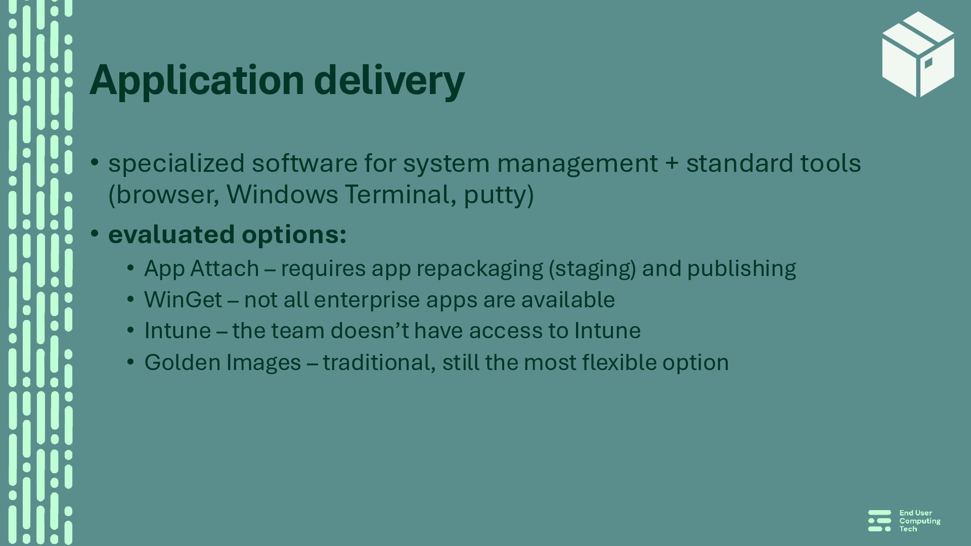 tools (browser, Windows Terminal, putty) • evaluated options: • App Attach – requires app repackaging (staging) and publishing • WinGet – not all enterprise apps are available • Intune – the team doesn’t have access to Intune • Golden Images – traditional, still the most flexible option