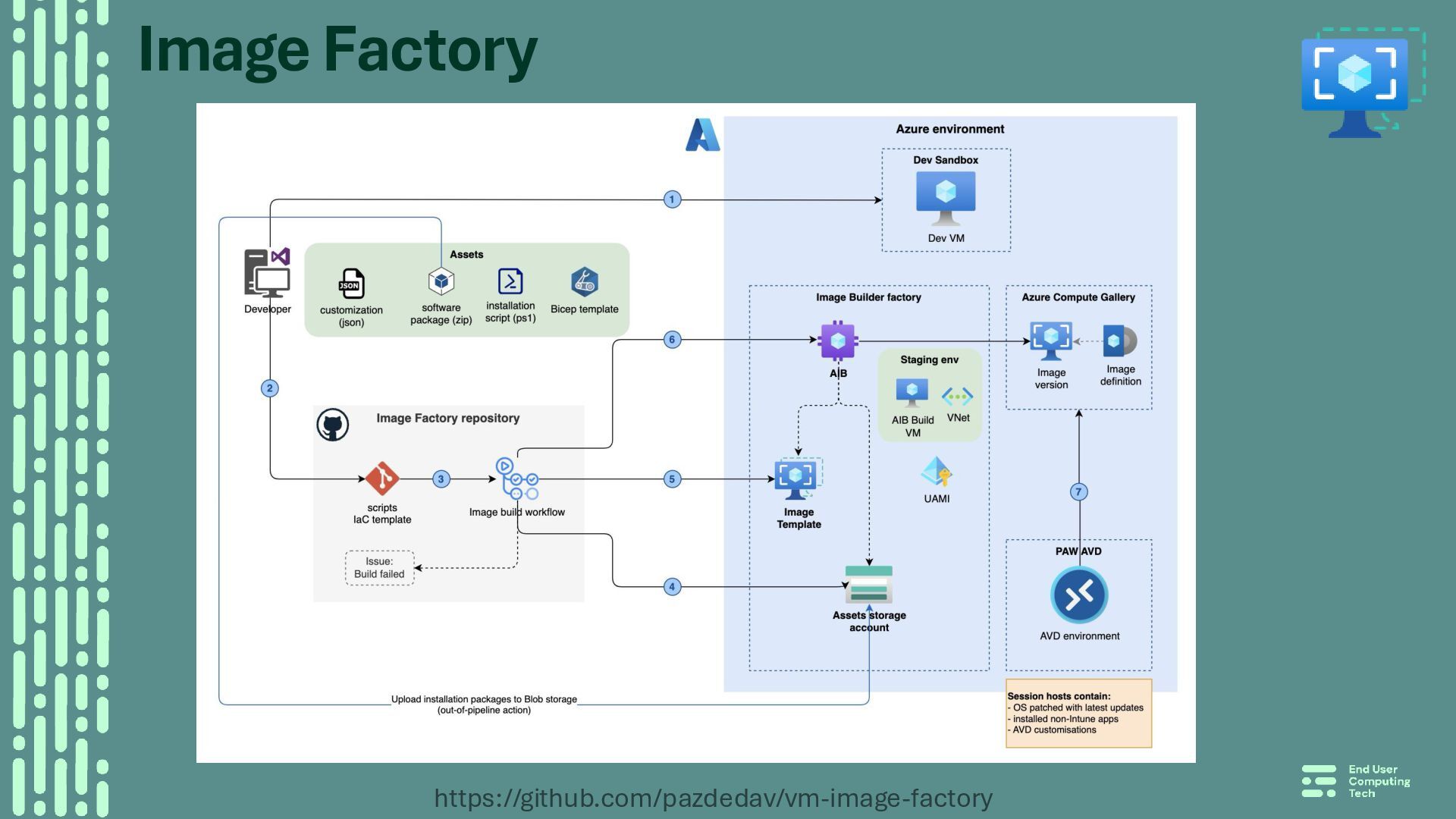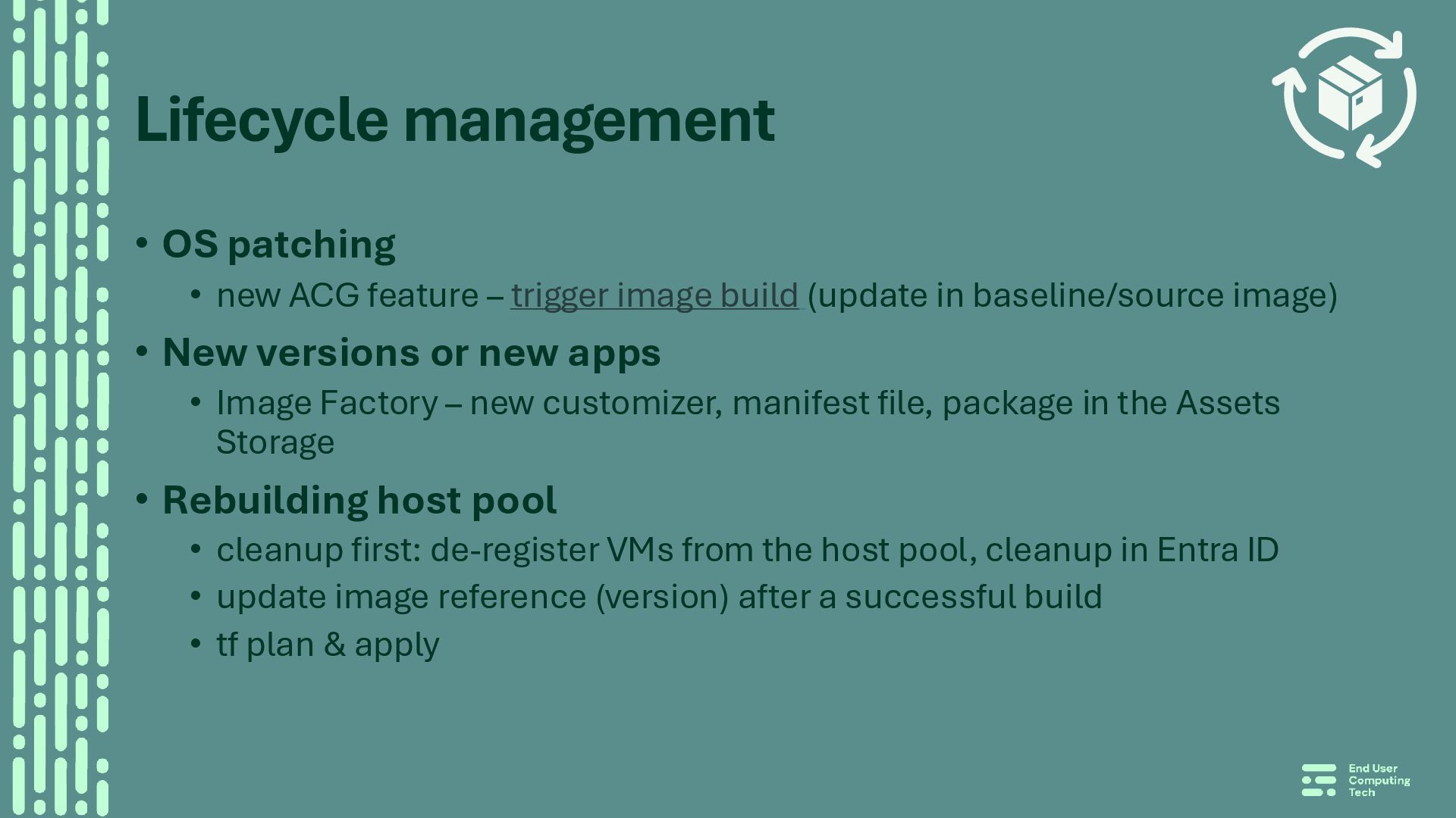 trigger image build (update in baseline/source image) • New versions or new apps • Image Factory – new customizer, manifest file, package in the Assets Storage • Rebuilding host pool • cleanup first: de-register VMs from the host pool, cleanup in Entra ID • update image reference (version) after a successful build • tf plan & apply