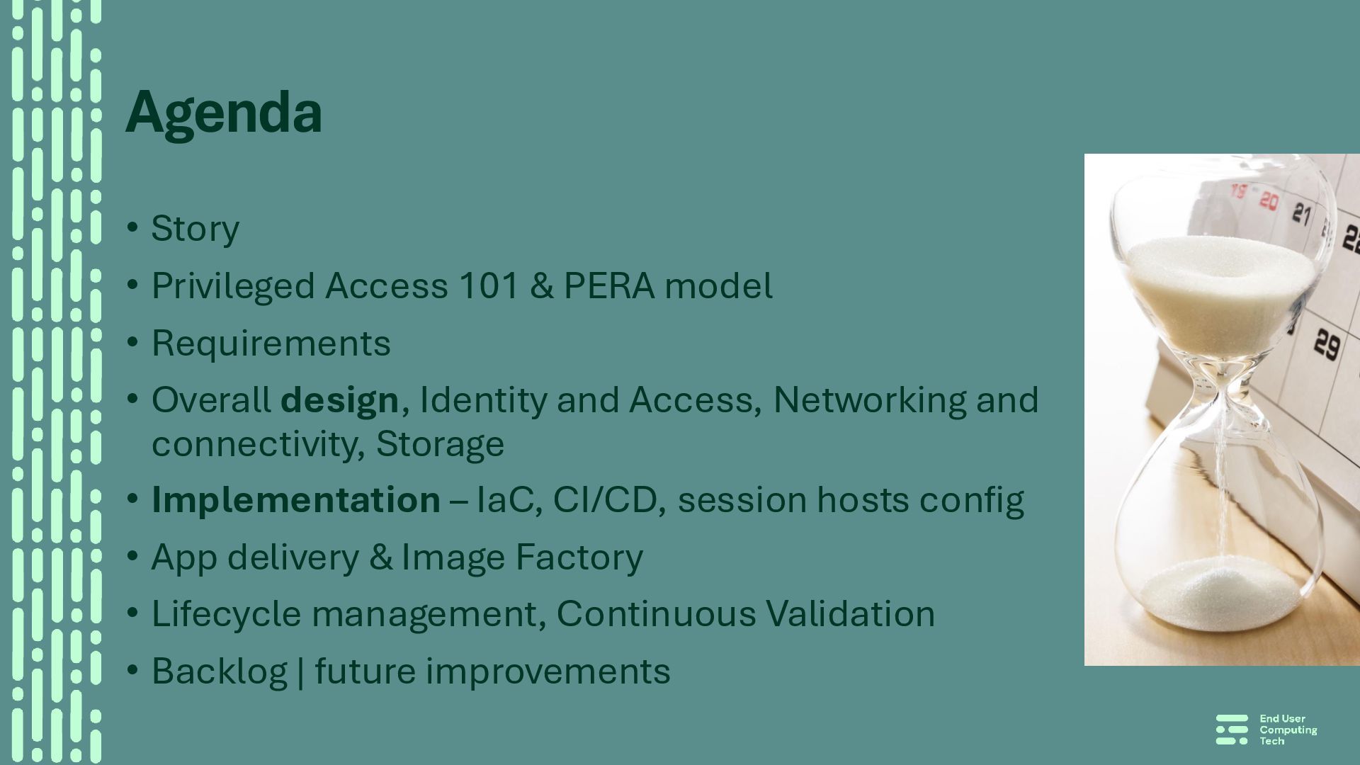 • Requirements • Overall design, Identity and Access, Networking and connectivity, Storage • Implementation – IaC, CI/CD, session hosts config • App delivery & Image Factory • Lifecycle management, Continuous Validation • Backlog | future improvements