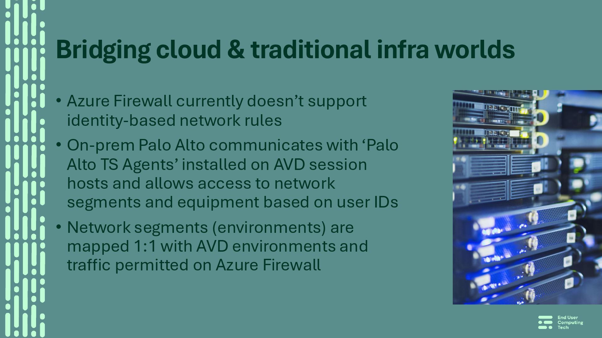 doesn’t support identity-based network rules • On-prem Palo Alto communicates with ‘Palo Alto TS Agents’ installed on AVD session hosts and allows access to network segments and equipment based on user IDs • Network segments (environments) are mapped 1:1 with AVD environments and traffic permitted on Azure Firewall