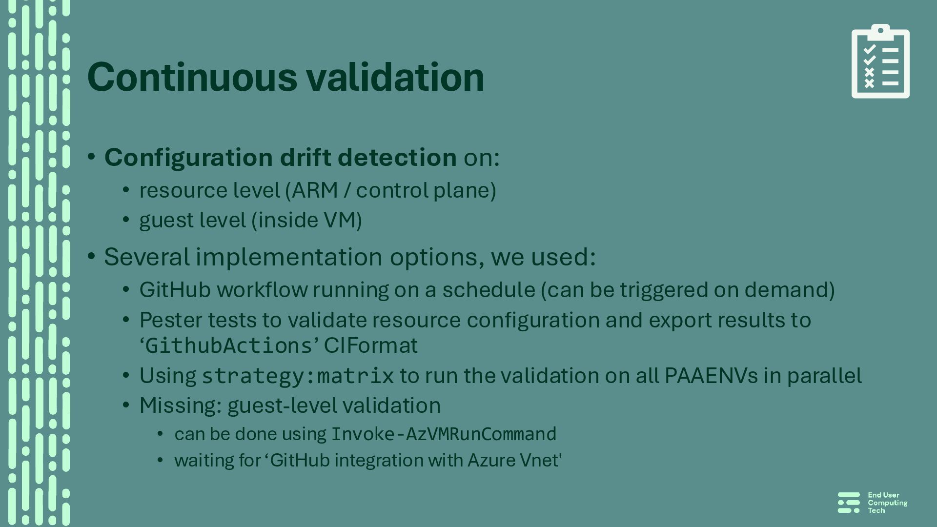 (ARM / control plane) • guest level (inside VM) • Several implementation options, we used: • GitHub workflow running on a schedule (can be triggered on demand) • Pester tests to validate resource configuration and export results to ‘GithubActions’ CIFormat • Using strategy:matrix to run the validation on all PAAENVs in parallel • Missing: guest-level validation • can be done using Invoke-AzVMRunCommand • waiting for ‘GitHub integration with Azure Vnet'