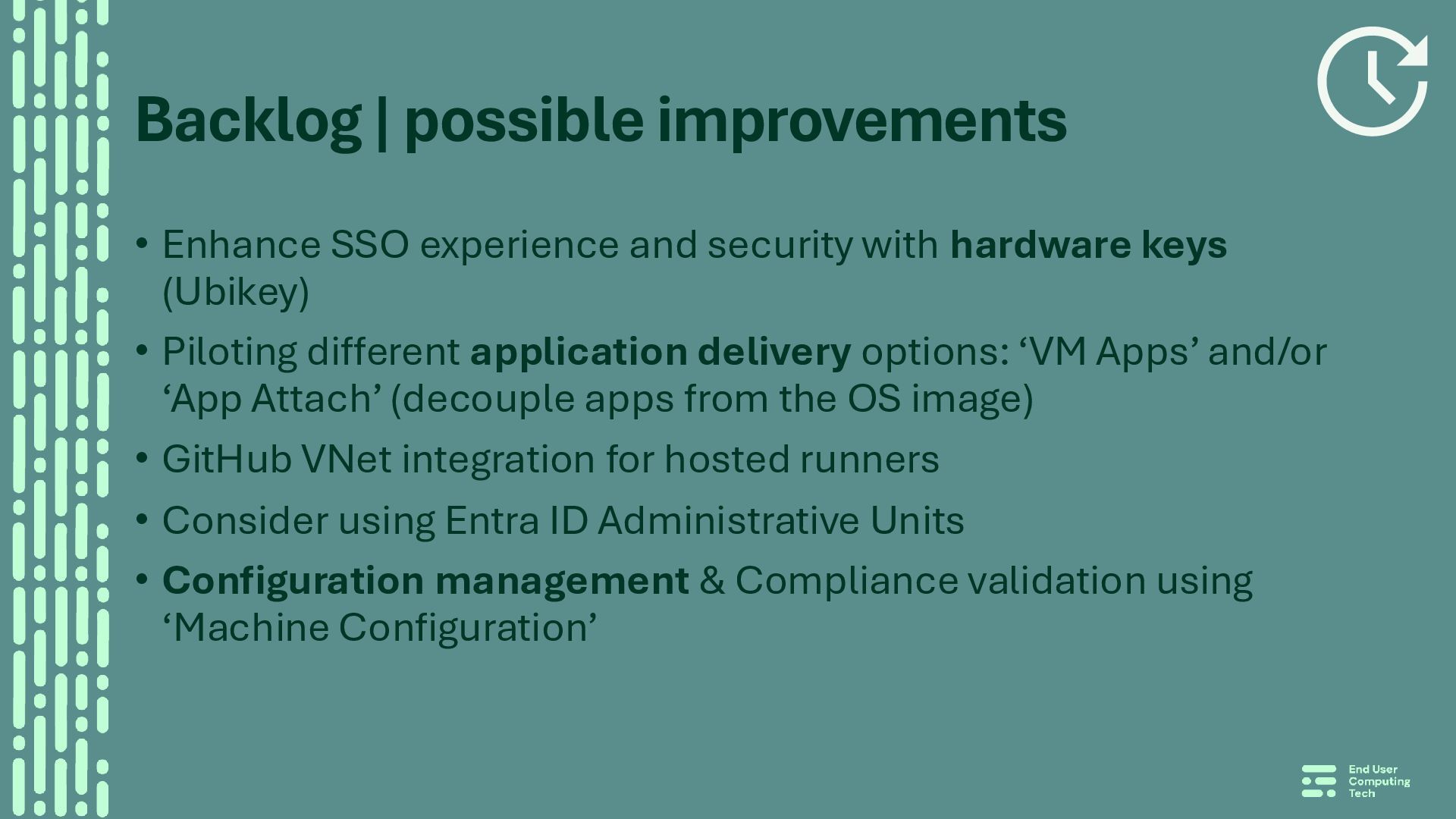 with hardware keys (Ubikey) • Piloting different application delivery options: ‘VM Apps’ and/or ‘App Attach’ (decouple apps from the OS image) • GitHub VNet integration for hosted runners • Consider using Entra ID Administrative Units • Configuration management & Compliance validation using ‘Machine Configuration’