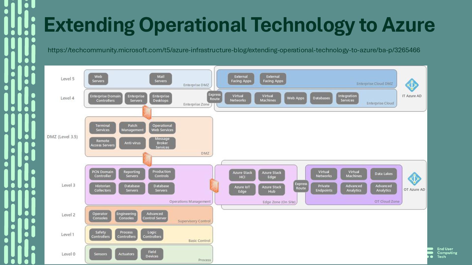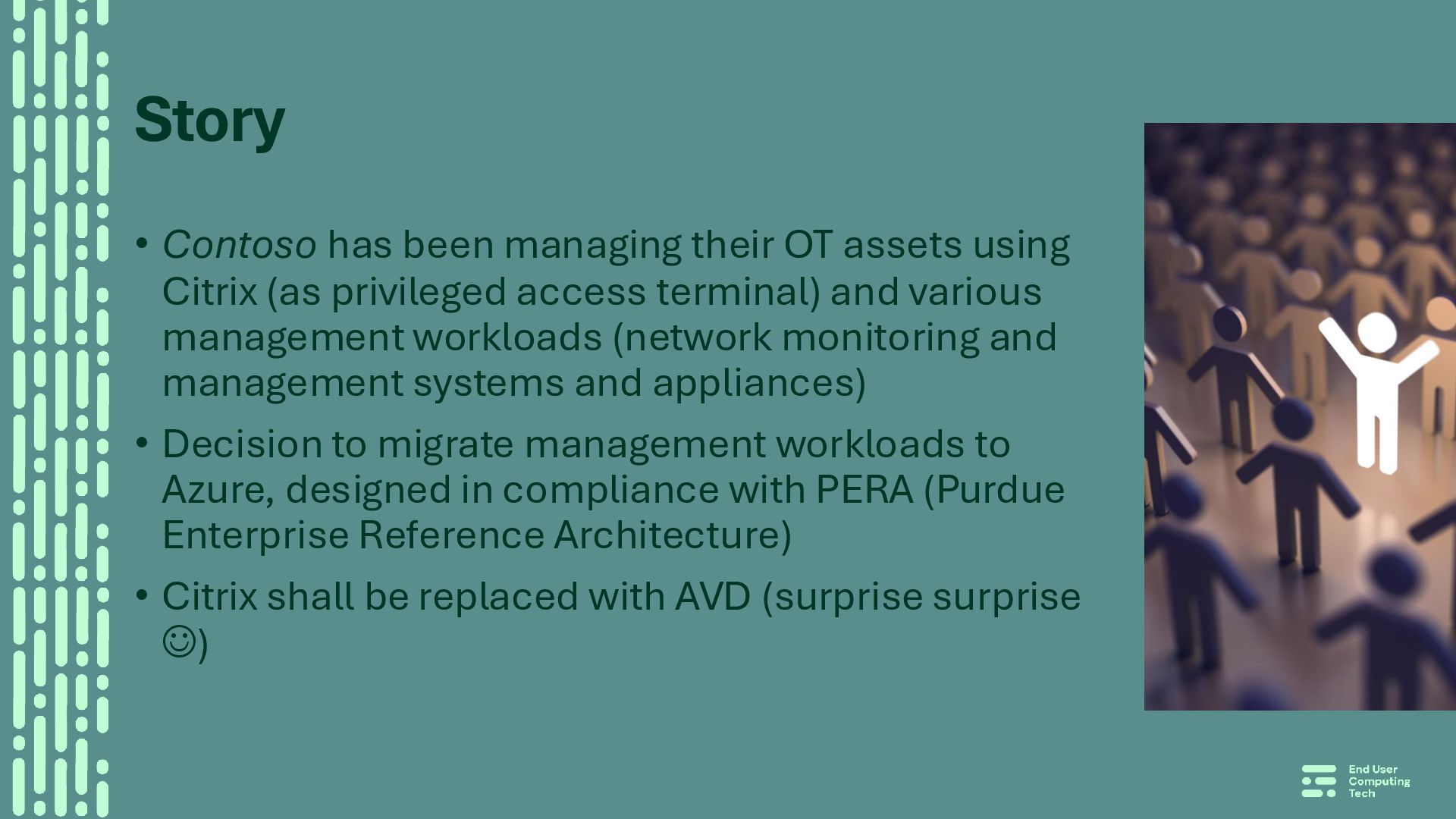 Citrix (as privileged access terminal) and various management workloads (network monitoring and management systems and appliances) • Decision to migrate management workloads to Azure, designed in compliance with PERA (Purdue Enterprise Reference Architecture) • Citrix shall be replaced with AVD (surprise surprise ☺)