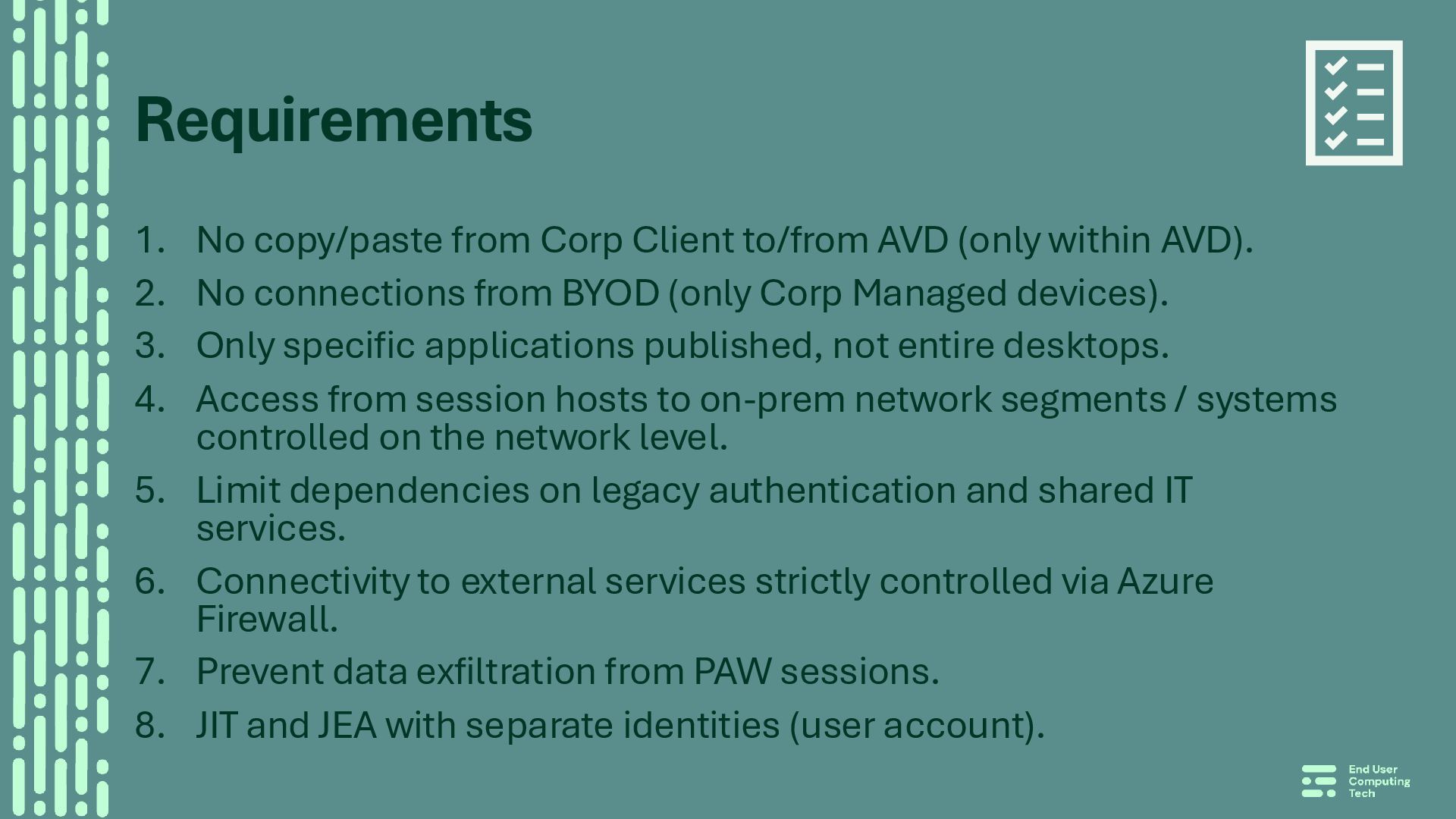 within AVD). 2. No connections from BYOD (only Corp Managed devices). 3. Only specific applications published, not entire desktops. 4. Access from session hosts to on-prem network segments / systems controlled on the network level. 5. Limit dependencies on legacy authentication and shared IT services. 6. Connectivity to external services strictly controlled via Azure Firewall. 7. Prevent data exfiltration from PAW sessions. 8. JIT and JEA with separate identities (user account).