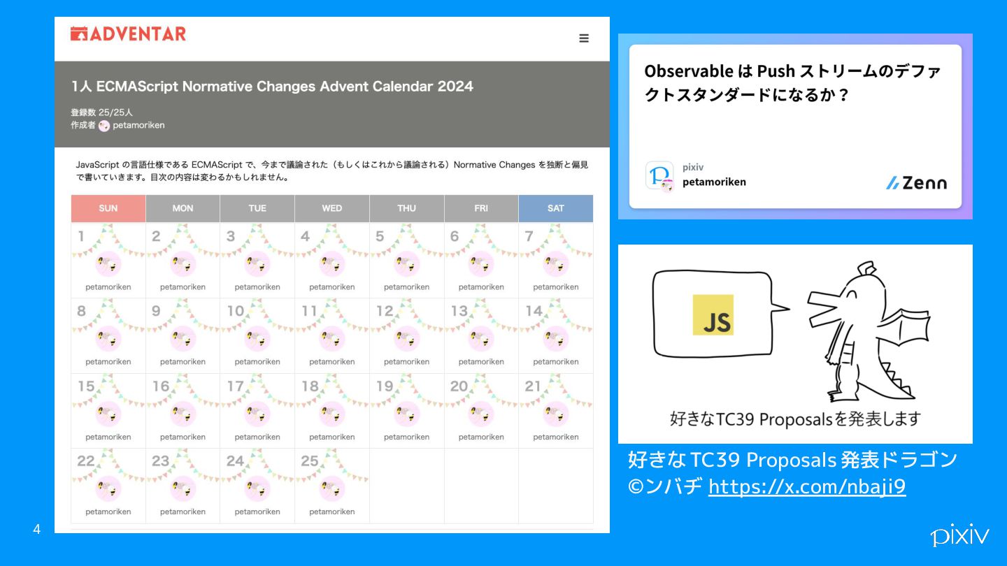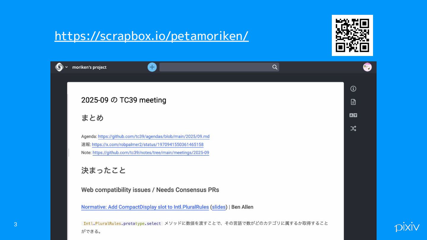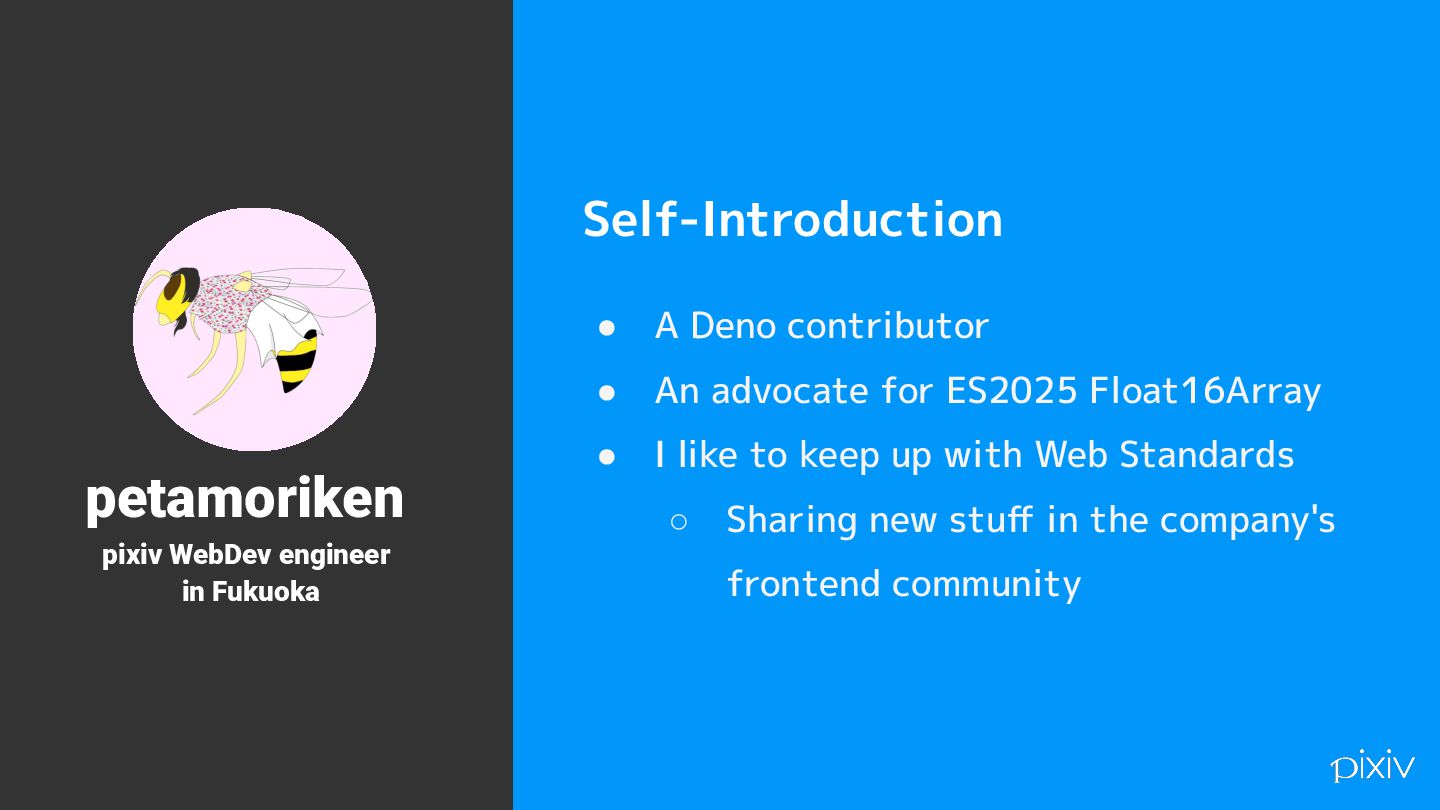 ES2025 Float16Array • I like to keep up with Web Standards ◦ Sharing new stuff in the company's frontend community petamoriken pixiv WebDev engineer in Fukuoka
