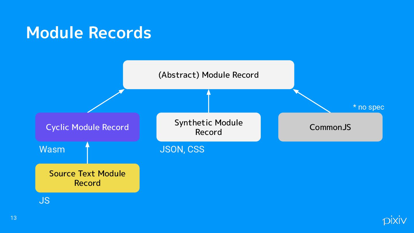 Cyclic Module Record Synthetic Module Record CommonJS Wasm JS JSON, CSS * no spec