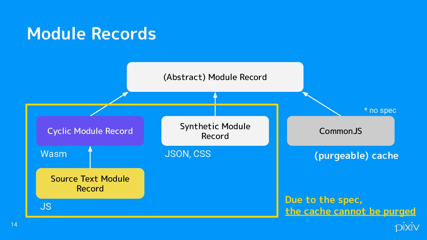Cyclic Module Record Synthetic Module Record CommonJS Wasm JS JSON, CSS * no spec Due to the spec, the cache cannot be purged (purgeable) cache